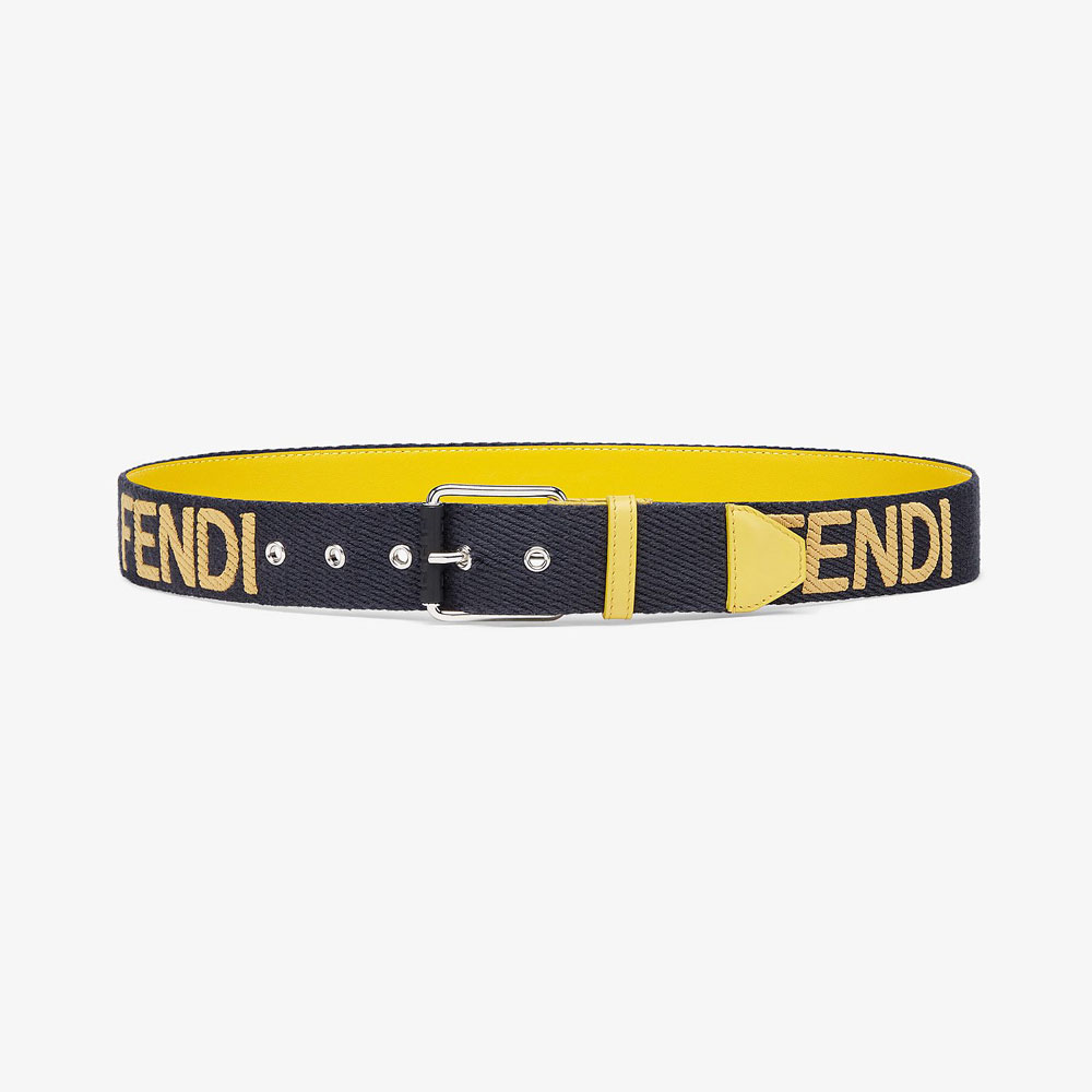Belt with single loop. Pin buckle with rubber roller. Made of dark grey tech fabric. Embellished with yellow jacquard Fendi Roma lettering. Yellow leather lining. Palladium-finish metalware.