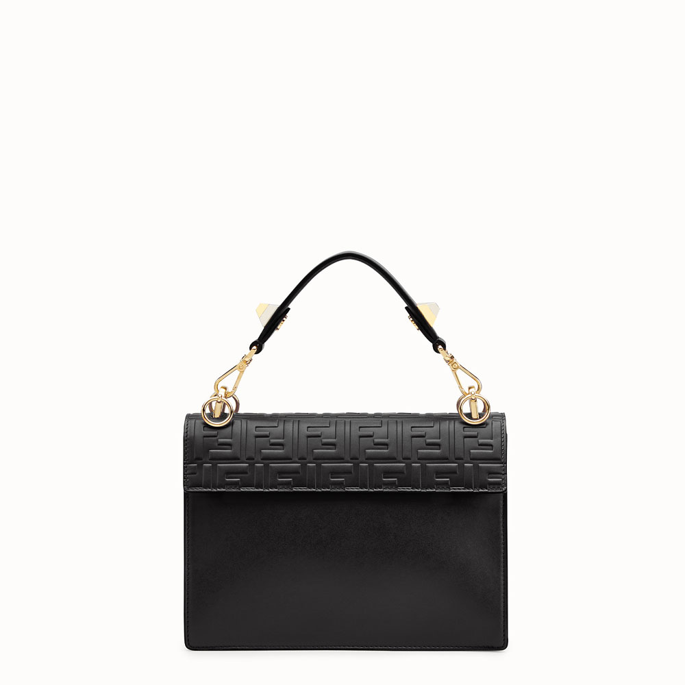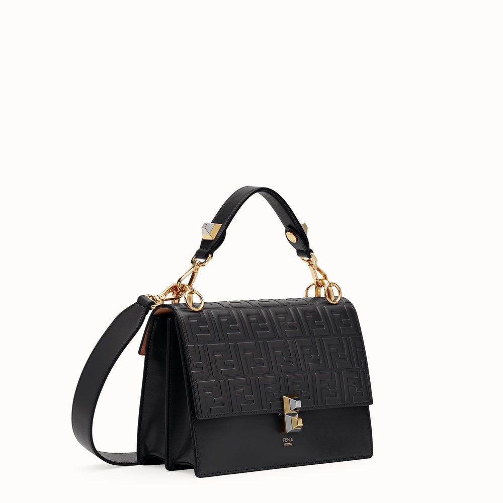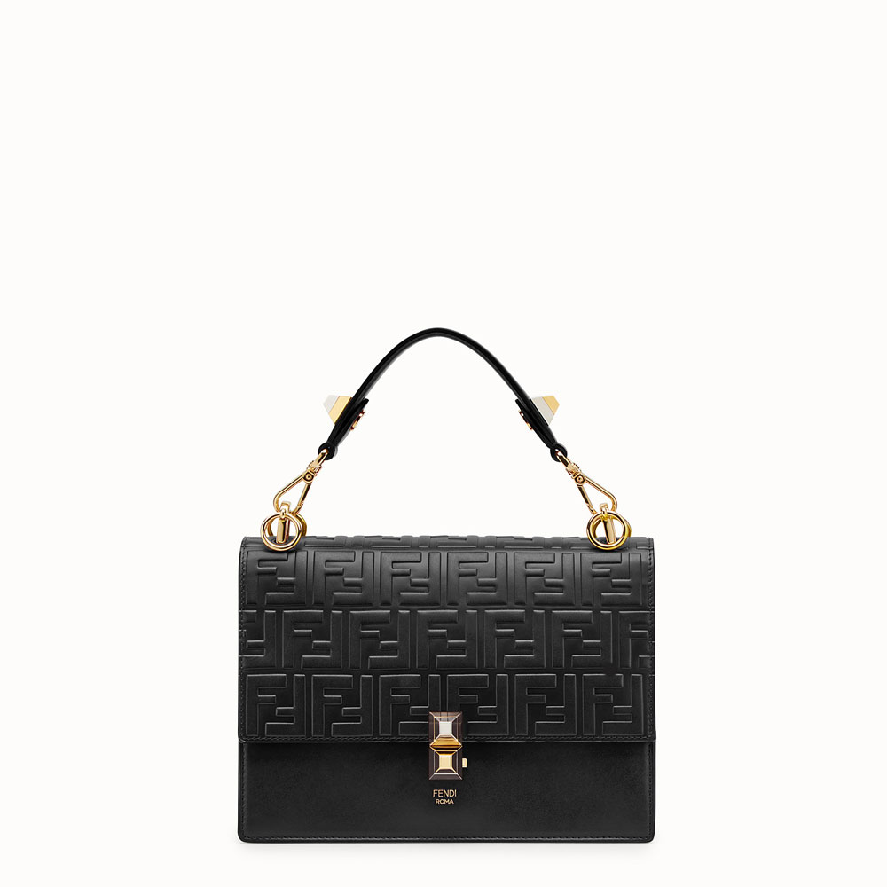 Black leather bag KAN I Bag with flap and fastening with double studs in two-tone plexiglass. The gusseted interior features a pocket and two compartments divided by a stiff partition. Can be worn cross-body or carried by hand thanks to the detachable shoulder strap. Made of black calfskin. The flap is decorated with an embossed FF pattern. Gold-finish metalware.