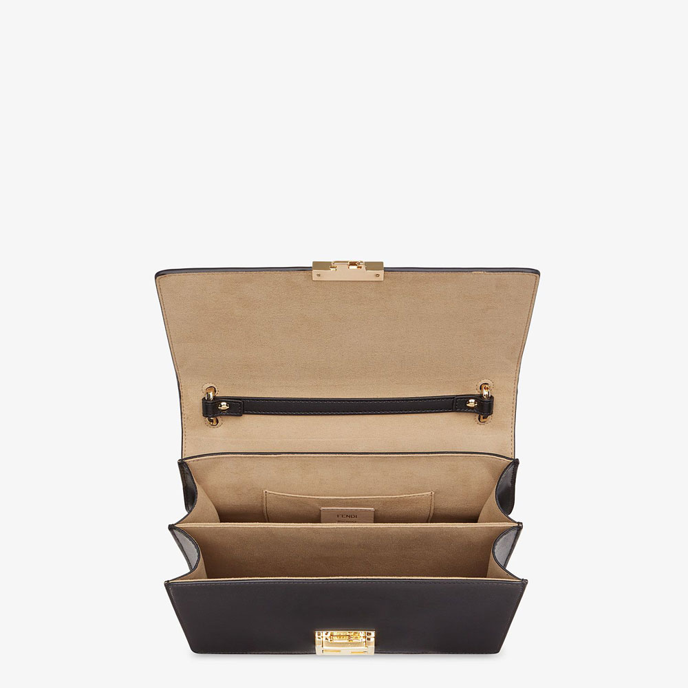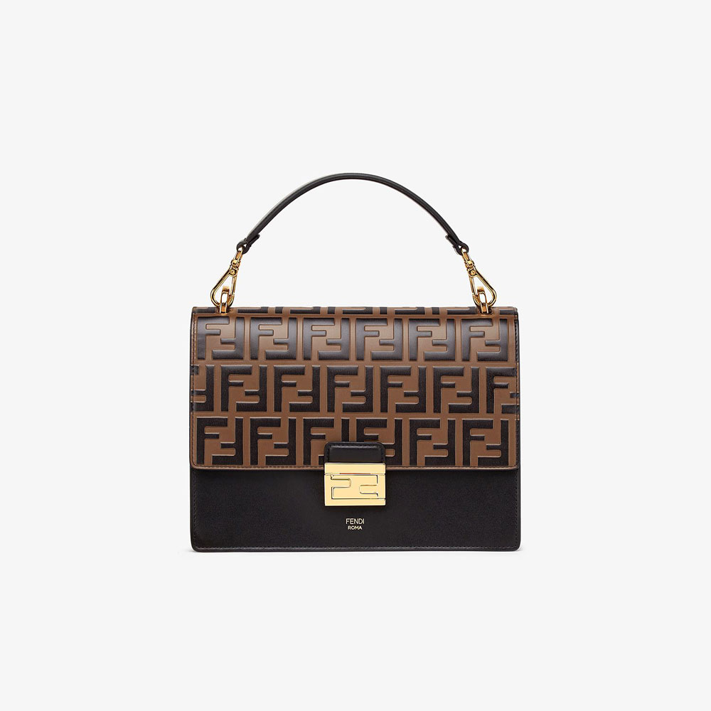 Bag with flap made of black leather with the embossed and hand-painted FF motif in brown. Decorated with an iconic FF press stud fastening. Featuring two gusseted compartments separated by a stiff partition, with an inner pocket and gold-finish metalware.