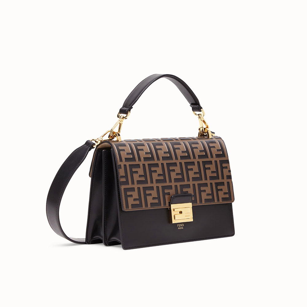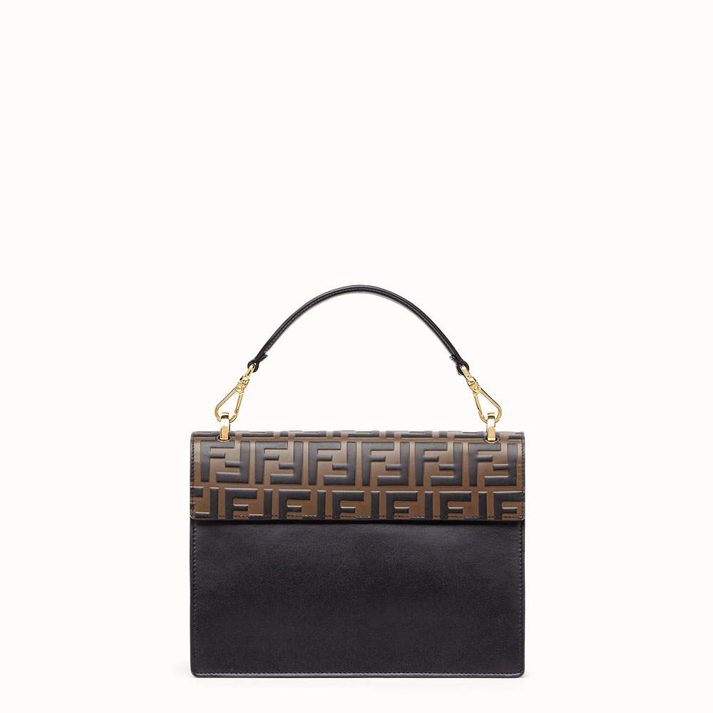 Bag with flap and fastening with double studs in two-tone plexiglass. The gusseted interior features a pocket and two compartments divided by a stiff partition. Can be worn cross-body or carried by hand thanks to the detachable shoulder strap. Made of black calfskin. The scalloped edges are painted in contrasting colour. Gold-finish metalware.