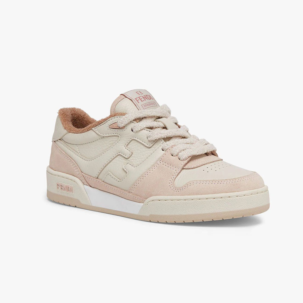 Fendi Match compact design sneakers with vintage label on tongue. Branded with FF pattern sewn on the side and embossed Fendi lettering on the sole. Made of pink suede with white leather details. Embellished with tone on tone terry collar and laces. Covered rubber cupsole with light beige bumper. The style includes a second pair of white terry laces. Mode:8E8252 AHH2 F1FHT