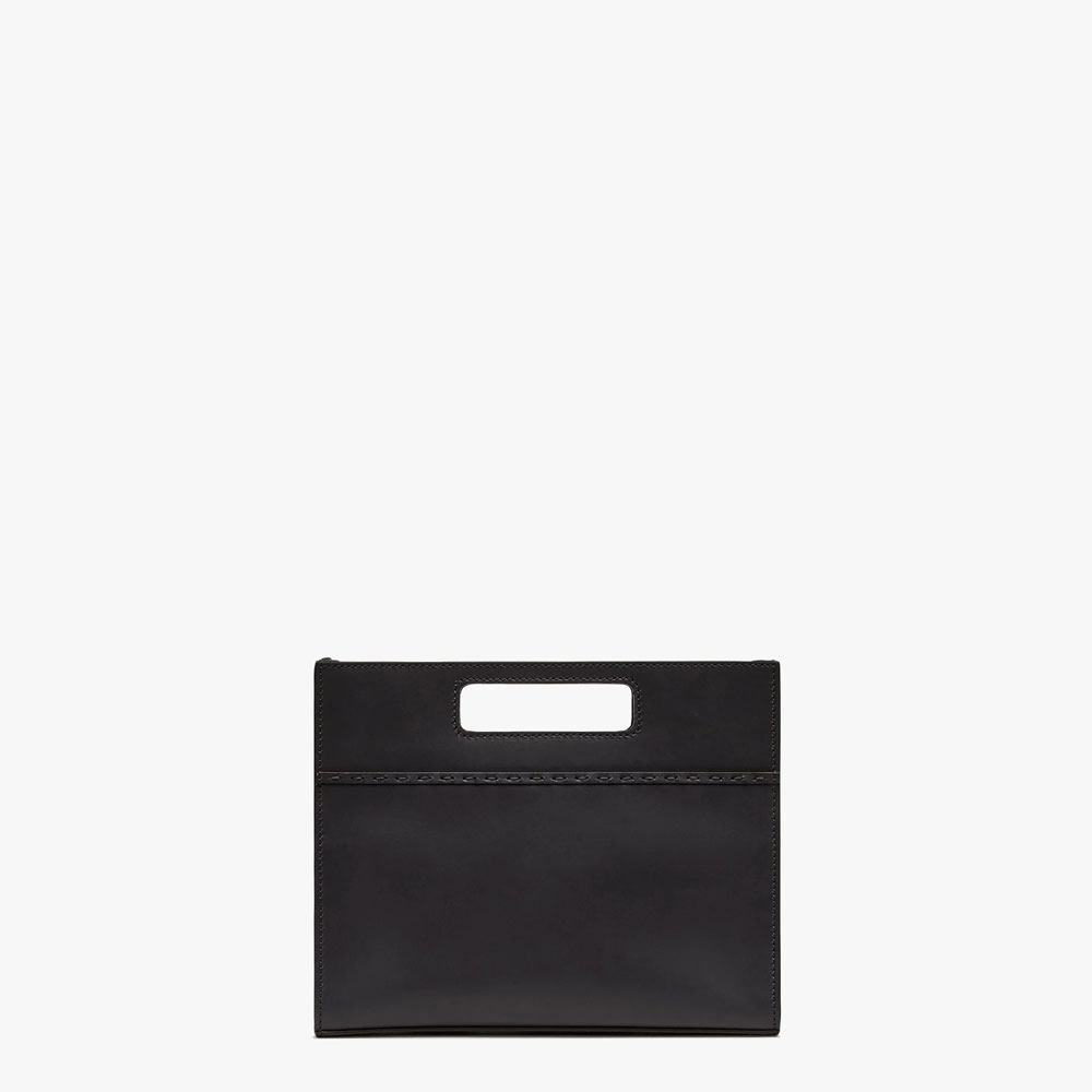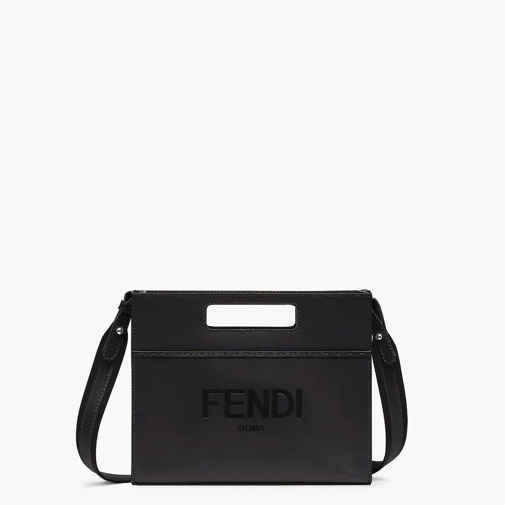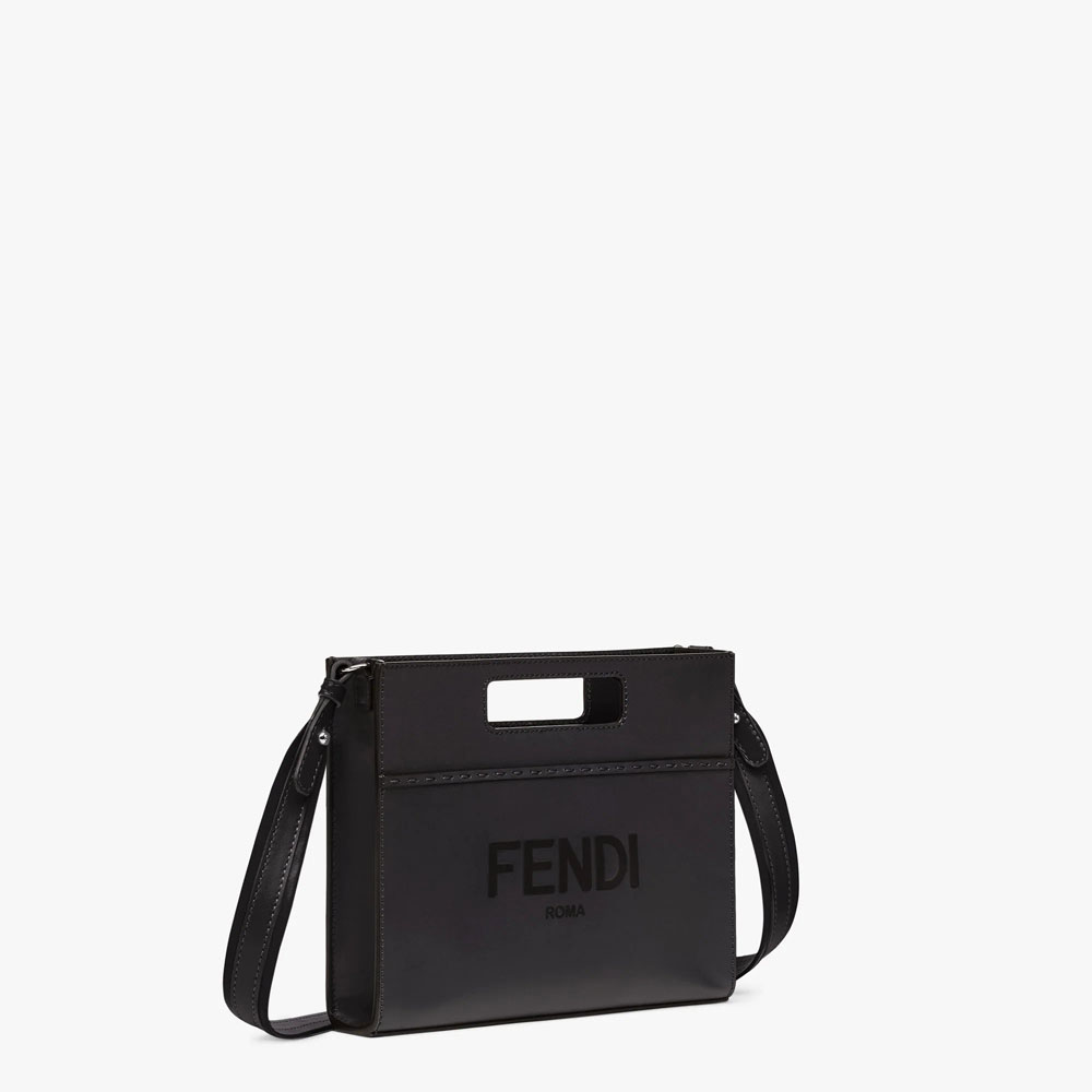 Black leather horizontal-design small shopping bag embellished with hot-stamped FENDI ROMA lettering. Features an internal compartment with zip fastening and palladium-finish metalware. Can be carried by hand with the handles. or on the shoulder thanks to the adjustable. detachable shoulder strap. Size:W24 x H19 x D5cm