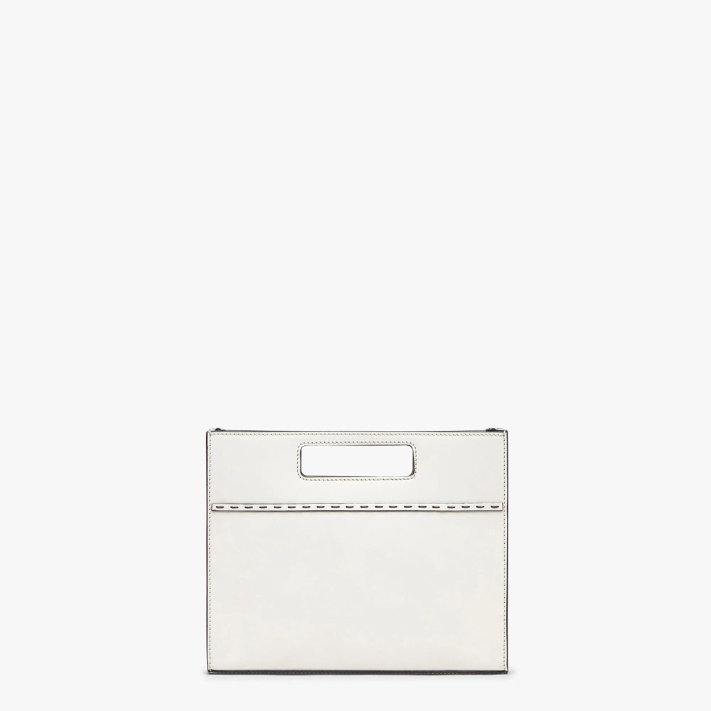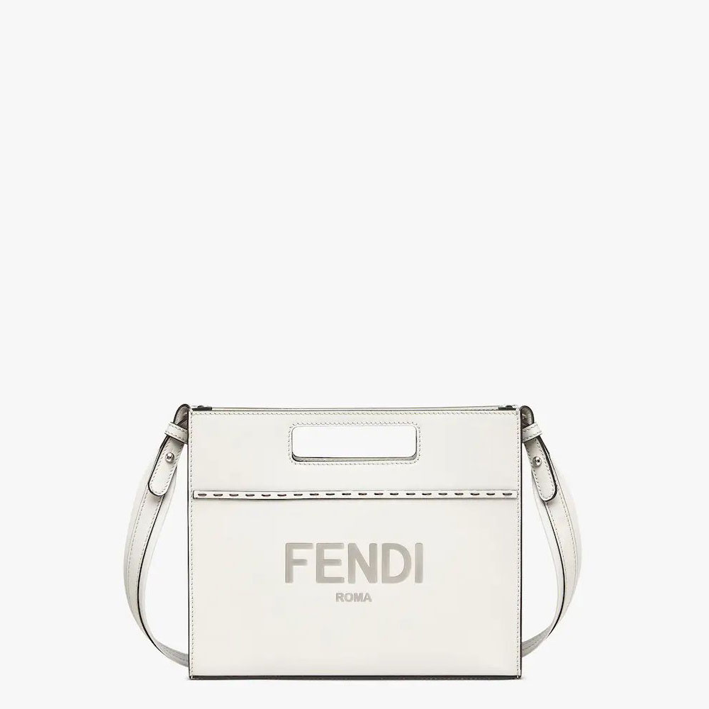 Light grey leather horizontal-design small shopping bag embellished with hot-stamped FENDI ROMA lettering. Features an internal compartment with zip fastening and palladium-finish metalware. Can be carried by hand with the handles. or on the shoulder thanks to the detachable shoulder strap. Size:W24 x H19 x D5cm