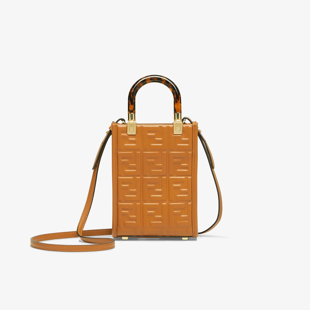 Mini Sunshine Shopper bag made of brown leather with 3D texture FF motif and rigid tortoiseshell-effect plexiglass handles.