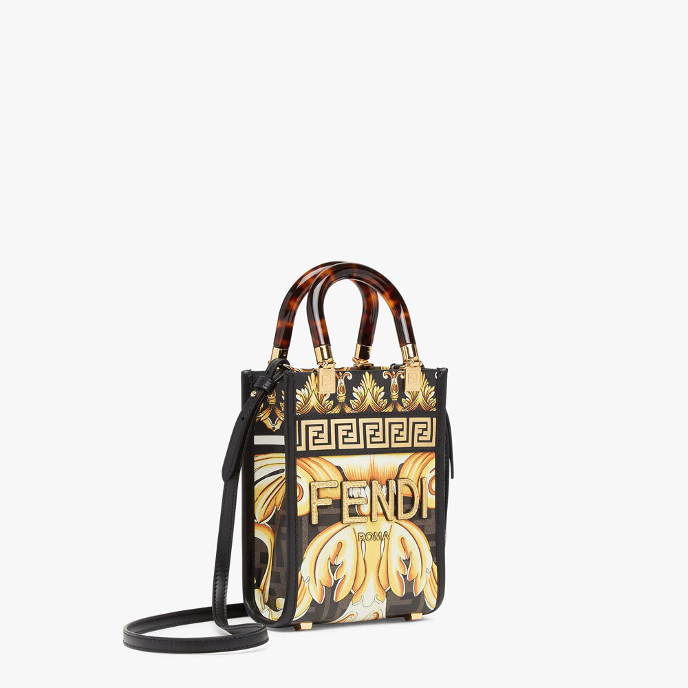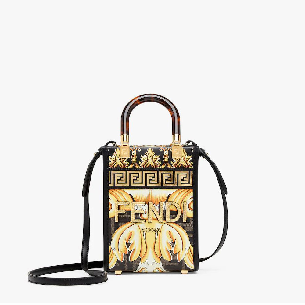 Mini Sunshine shopper made of leather with a Versace by Fendi print. Born of the creative collaboration between the two fashion houses. the graphics combine the iconic Fendi FF logo with the Versace Baroque print in black and gold. Laminated leather inlaid FENDI lettering and stiff tortoiseshell-effect plexiglass handles.