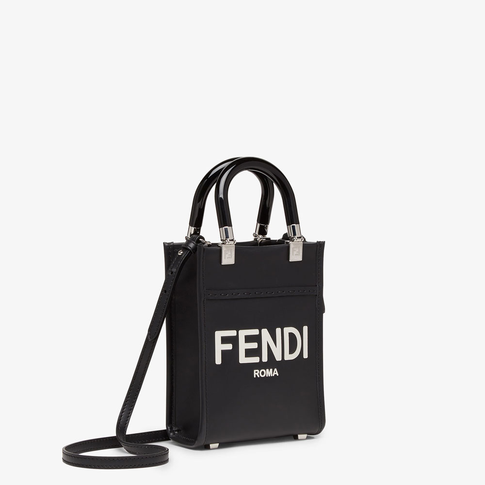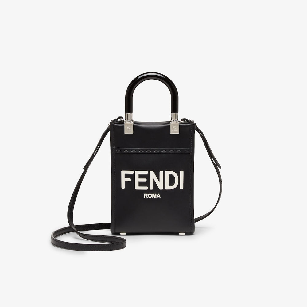 Mini Sunshine Shopper bag made of black leather with hot-stamped white FENDI ROMA lettering and stiff black plexiglass handles.