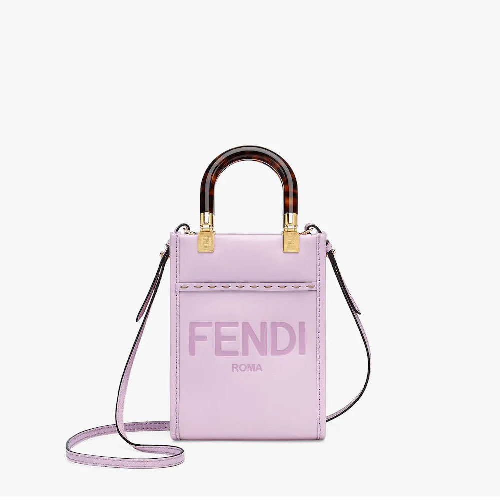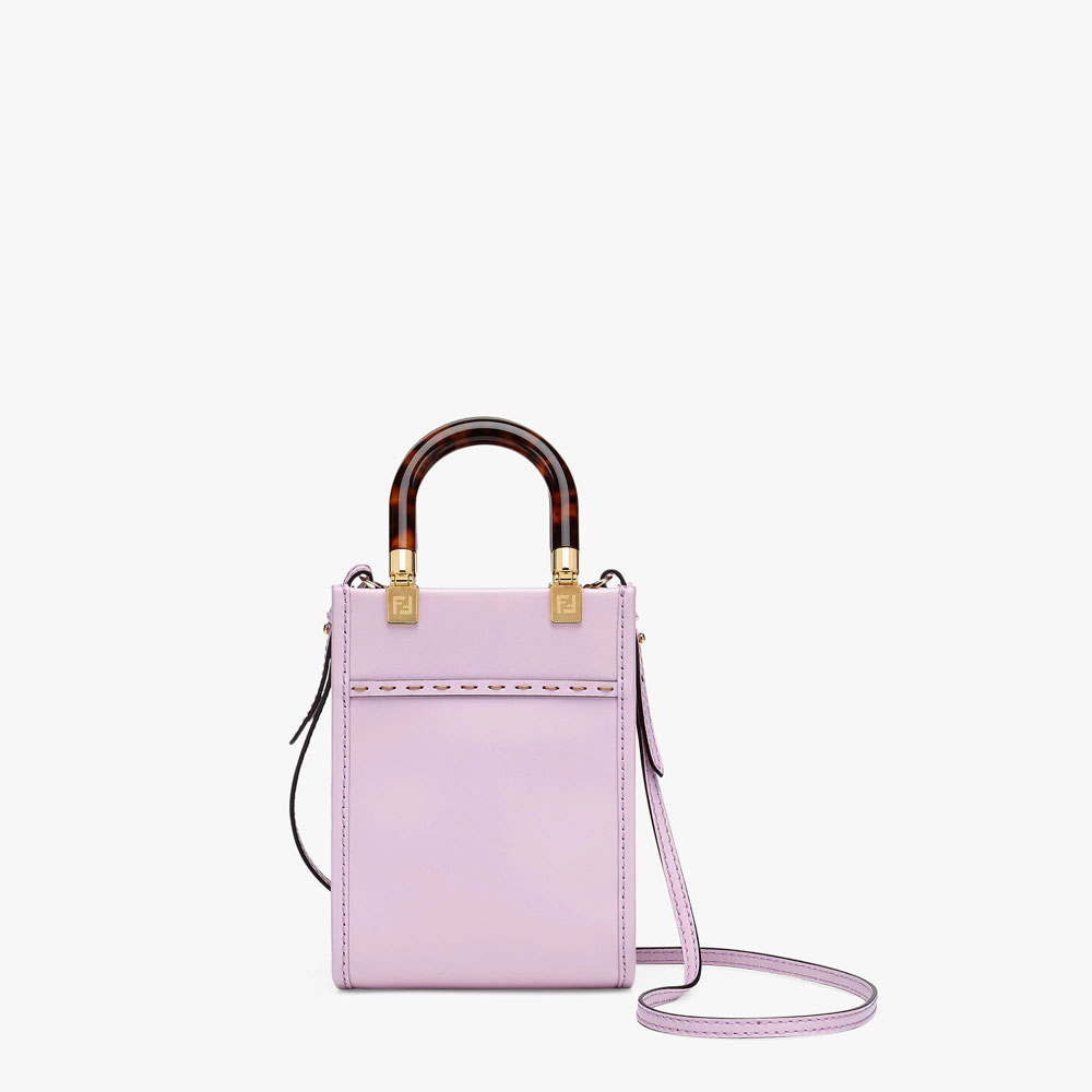 Mini Sunshine Shopper bag made of lilac leather with hot-stamped "FENDI ROMA" and stiff tortoiseshell-effect plexiglass handles.