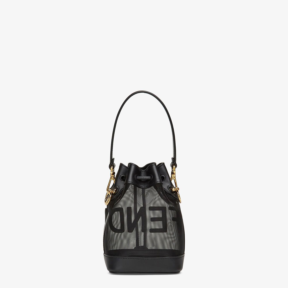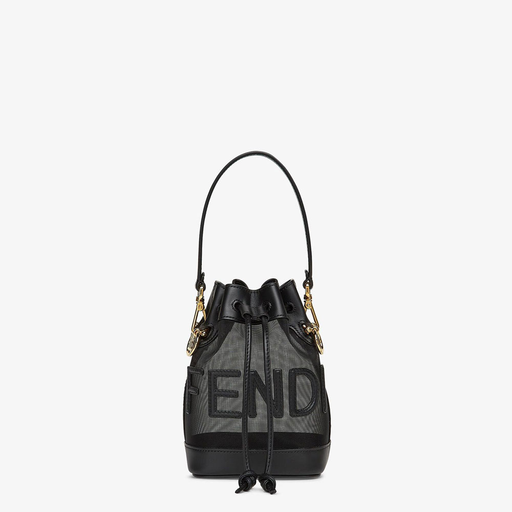 Mini Mon Tresor bucket bag made of black mesh and featuring Fendi lettering and a tone on tone leather trim.