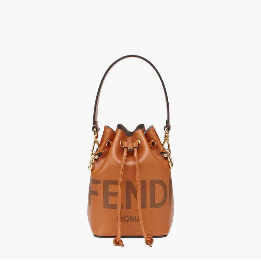 Mon Tresor small bucket bag made from brown leather with hot-stamped �FENDI ROMA�. Lined and with gold-finish metalware. Two detachable shoulder straps. one long and one short. to wear the bag over the shoulder or cross-body.
