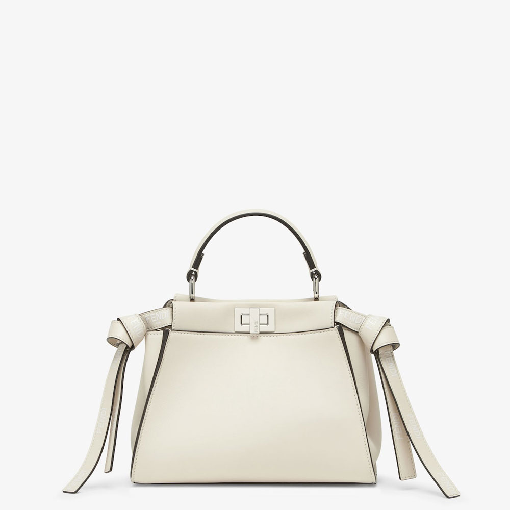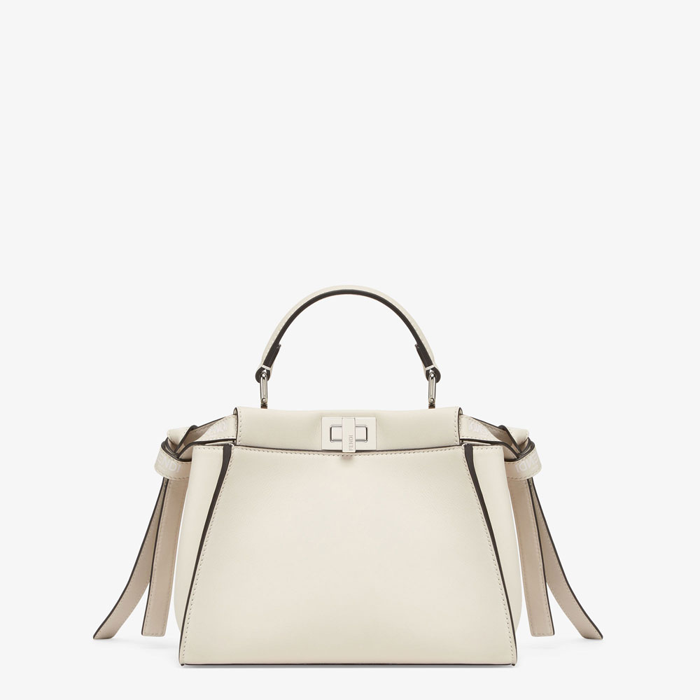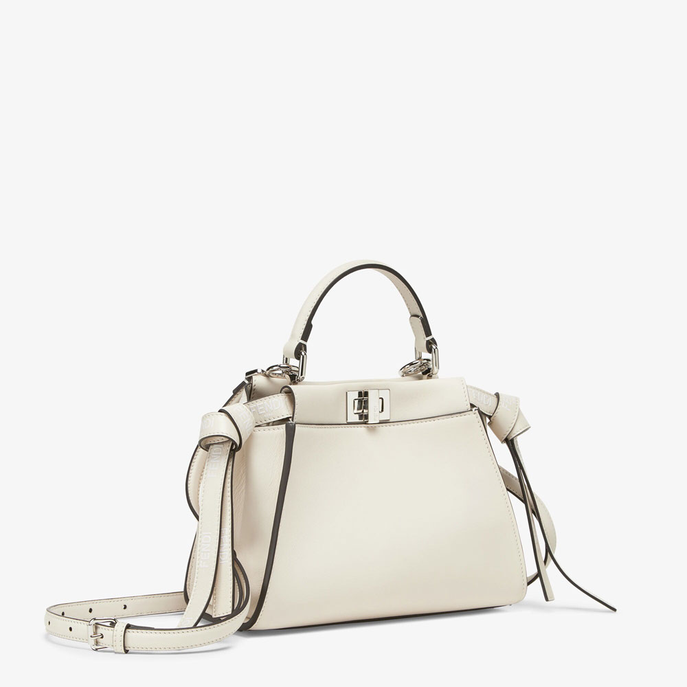 Iconic small Peekaboo bag. Made of milk white leather with long knotted side laces. Printed with a glossy-effect embossed Fendi Roma logo.