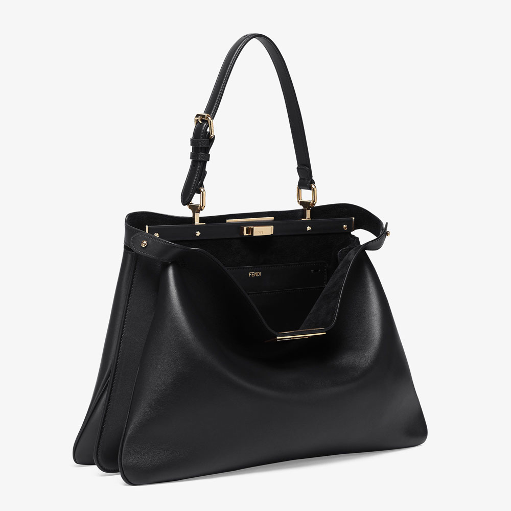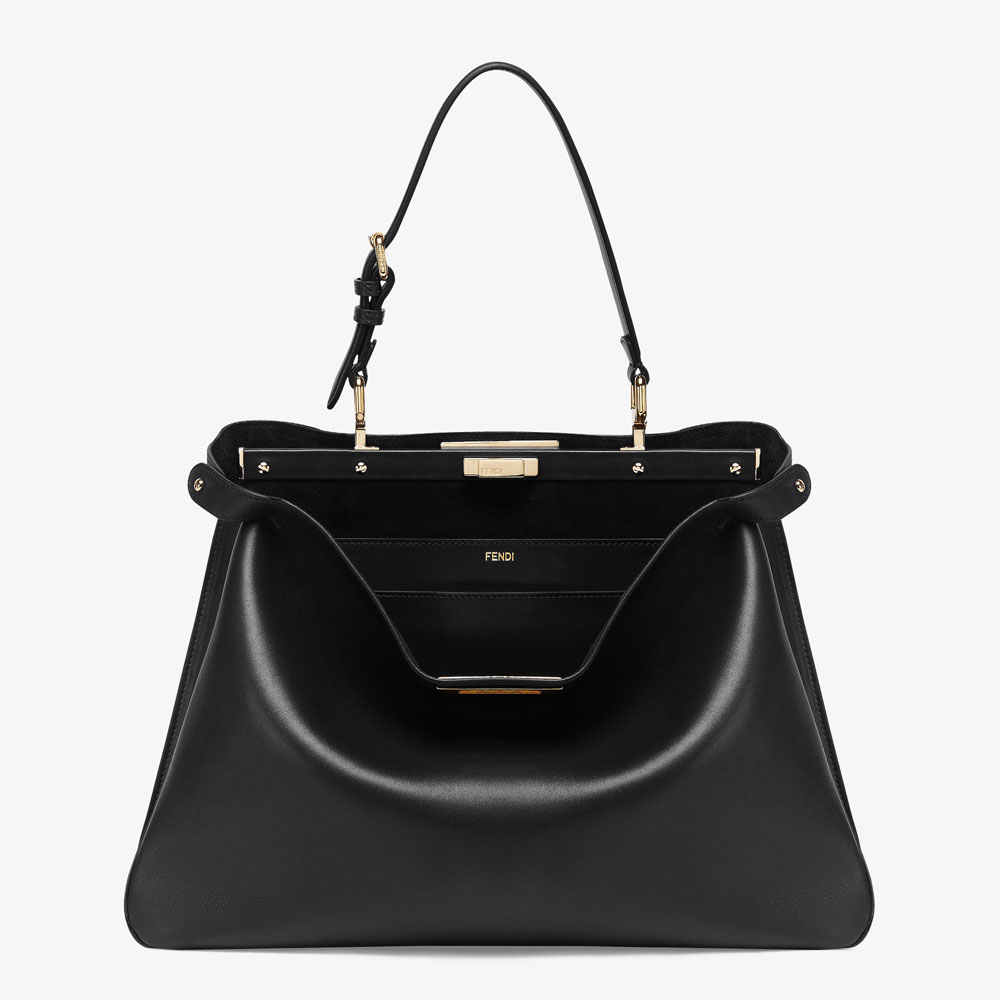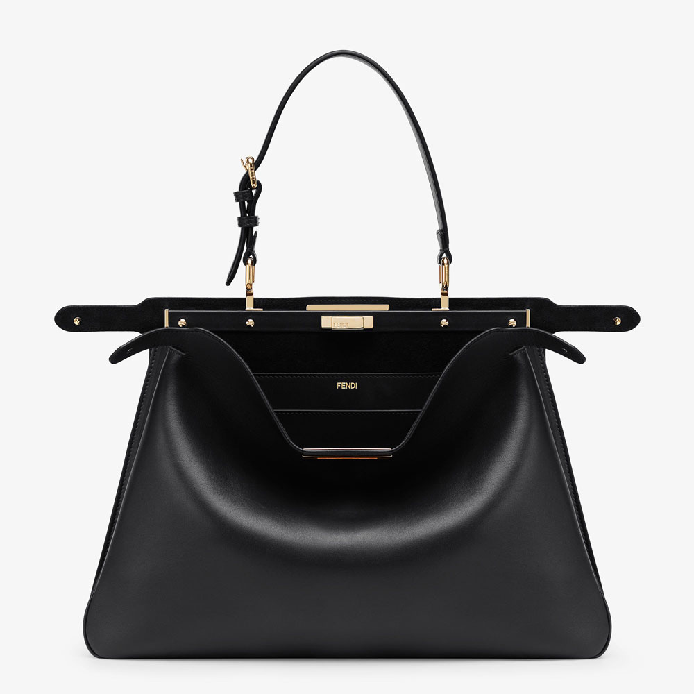 Fendi Peekaboo Bag in sleek black leather effortlessly complements versatile wardrobe staples. Pair this Peekaboo medium-sized bag with tailored trousers and a silk blouse for office elegance, or match it with high-waisted jeans and an oversized blazer for chic casual looks