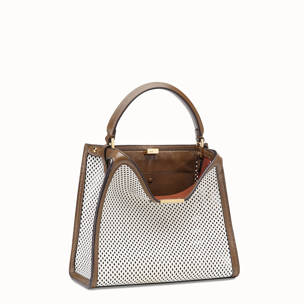 Medium handbag with internal pocket and iconic twist lock. Single handle and detachable shoulder strap. Made of white, perforated calf leather. Profiles and details in glossy brown, vintage-effect lamb leather. Contrasting two-tone lining. Gold-finish metalware.
