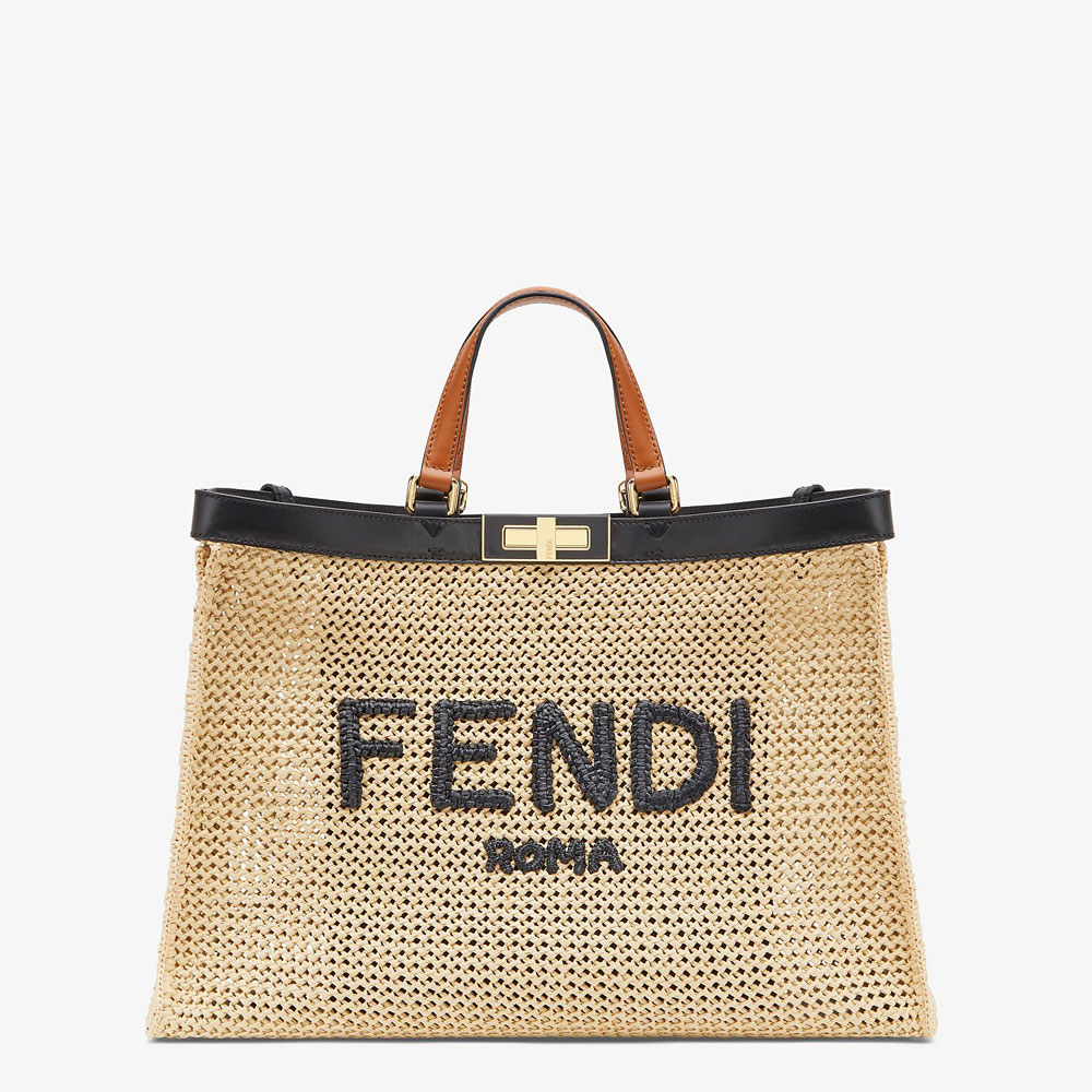 Medium Peekaboo X-Tote bag made of straw with a woven motif and contrasting Fendi Roma lettering embroidery. Trimmed in black and brown leather and decorated with the classic twist lock.