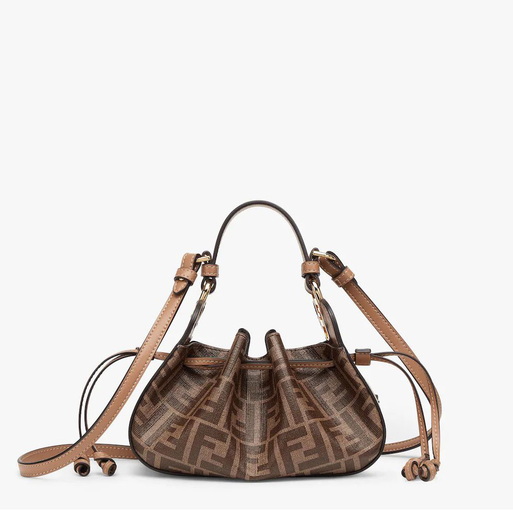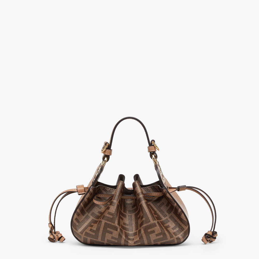 Mini-bag with drawstring closure made of PU fabric with brown FF print. Finished with beige leather details.