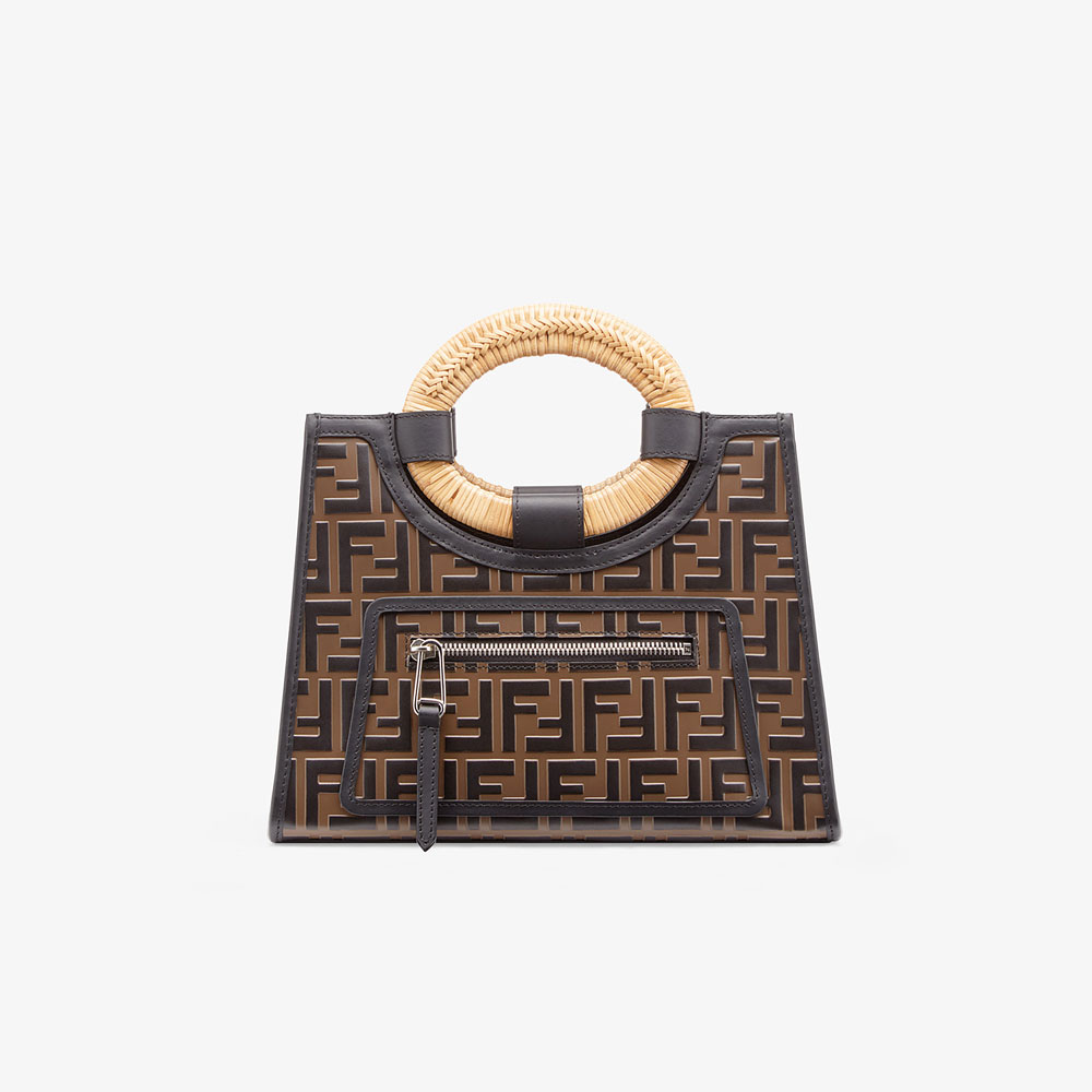 Small shopper with a zipped front pocket. Rigid oval double handle and decorative metal rings. Made in leather with the FF motif printed in relief and hand-painted in black and brown. Woven rattan handles. Palladium-finish metalware. Size: Length:28 Cm Height:21 Cm Depth:11 Cm