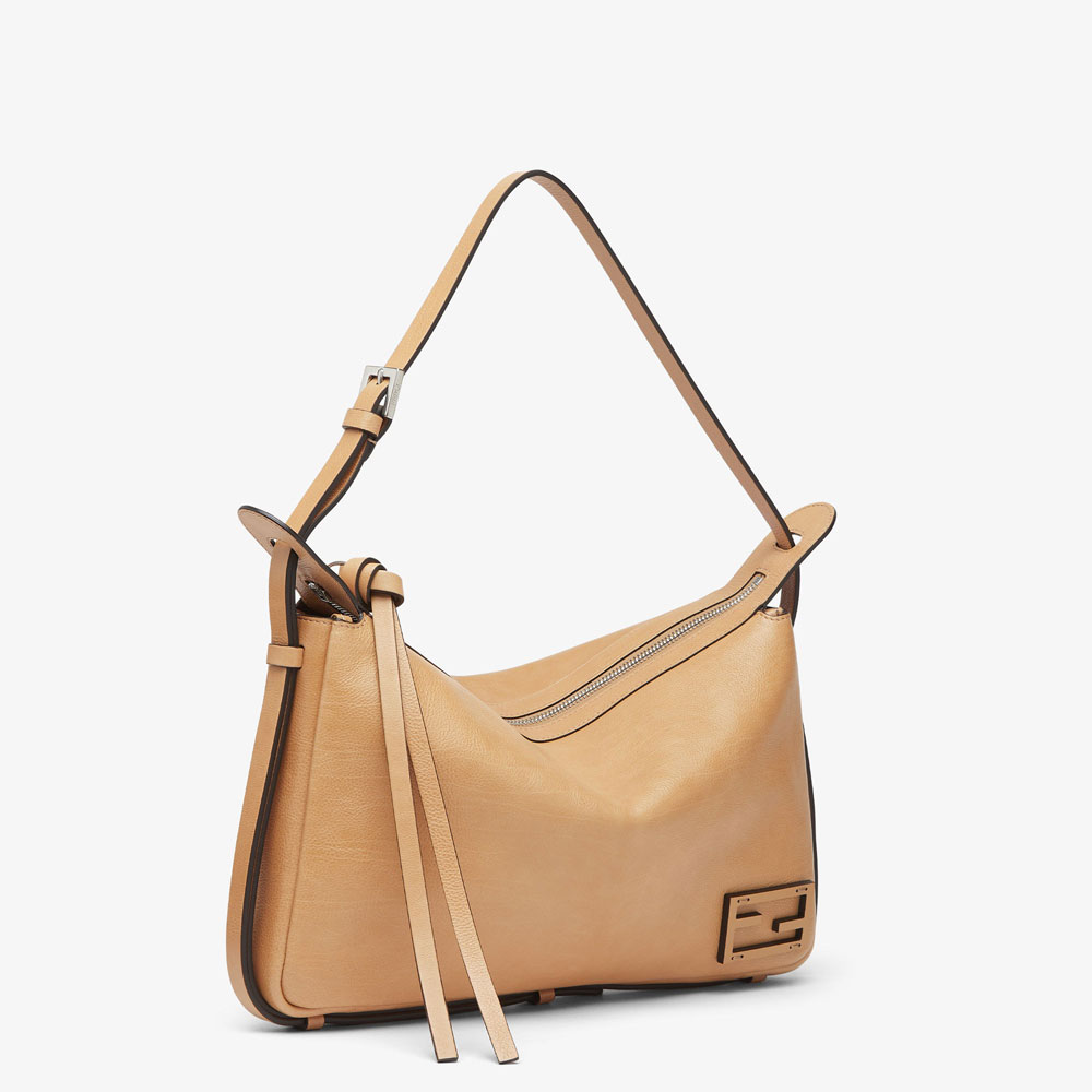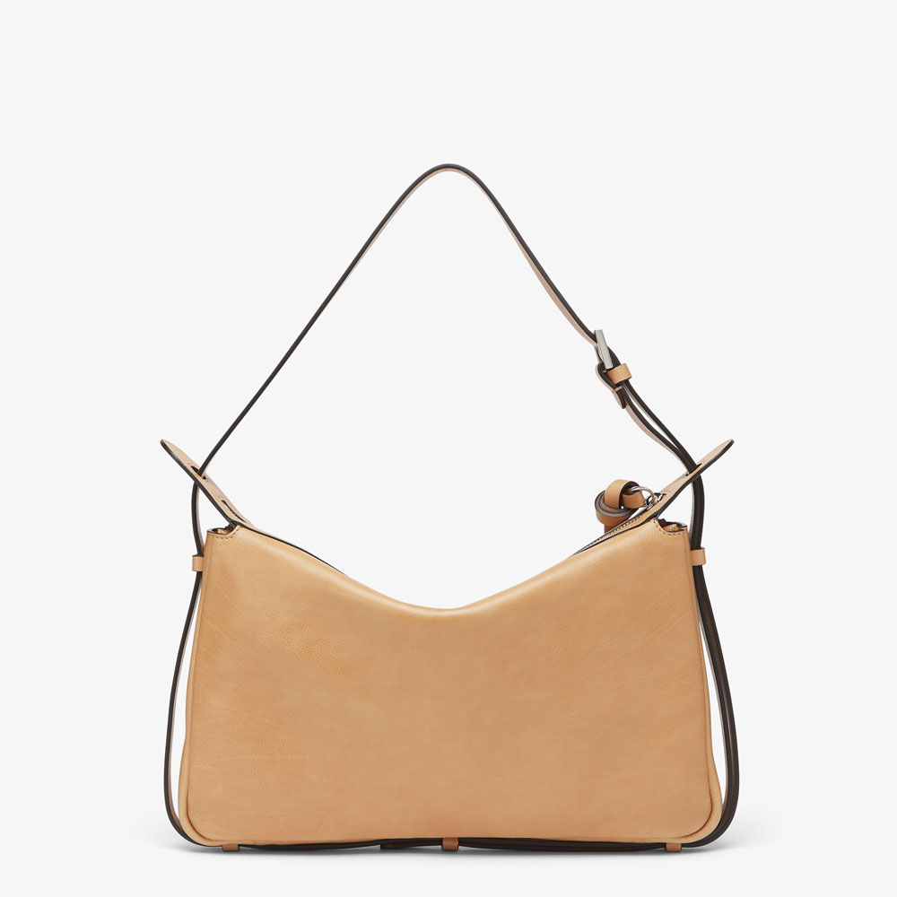 Medium Simply Fendi bag, a soft shoulder bag presented at the Fall-Winter 2024/25 fashion show, named after its elegant and essential design inspired by a 1990s archive style.Made of beige low-sheen finish calfskin.Decorated with the iconic FF embellishment in tone-on-tone patent leather.
