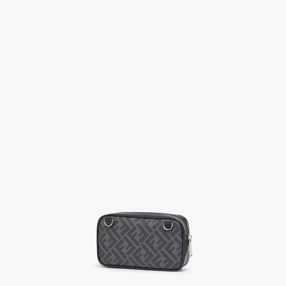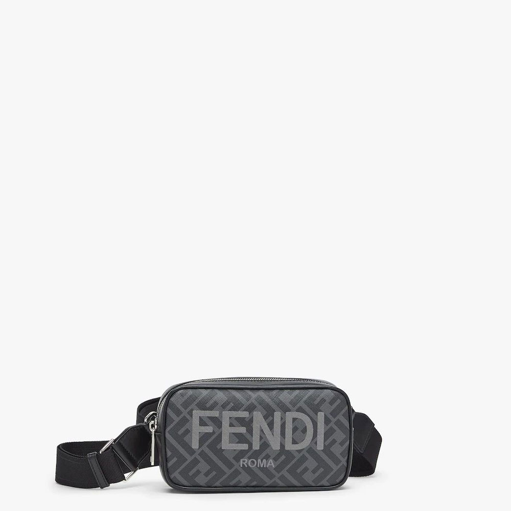 Compact shoulder bag with zip closure. The tech fabric cross-body shoulder strap with "FENDI" branding is adjustable and detachable. Made of textured fabric with a black and grey FF motif and FENDI ROMA print. Embellished with black leather details. Interior organised with a card holder pocket. Paladium-finish metalware. Size:W18.5 x H10 x D3cm