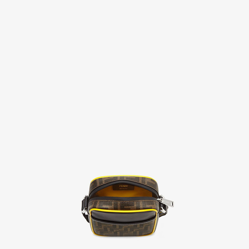 Cross-body bag with zip closure. Flat front pocket and ribbon shoulder strap. Made of PU and black leather. Decorated with the FF Karligraphy motif. Gold-finish metalware.