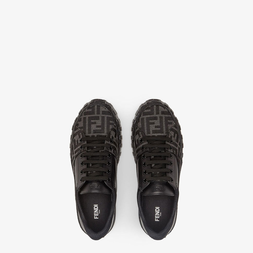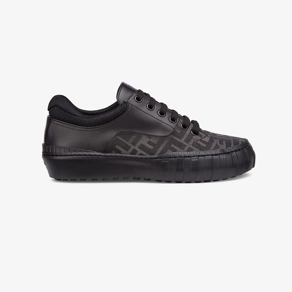 Fendi Force lace-up sneakers. Made of black leather and jacquard FF fabric in grey and black. Embellished with metal eyelets and tech mesh edging. Light rubber sole with embossed FF detail on the toe.