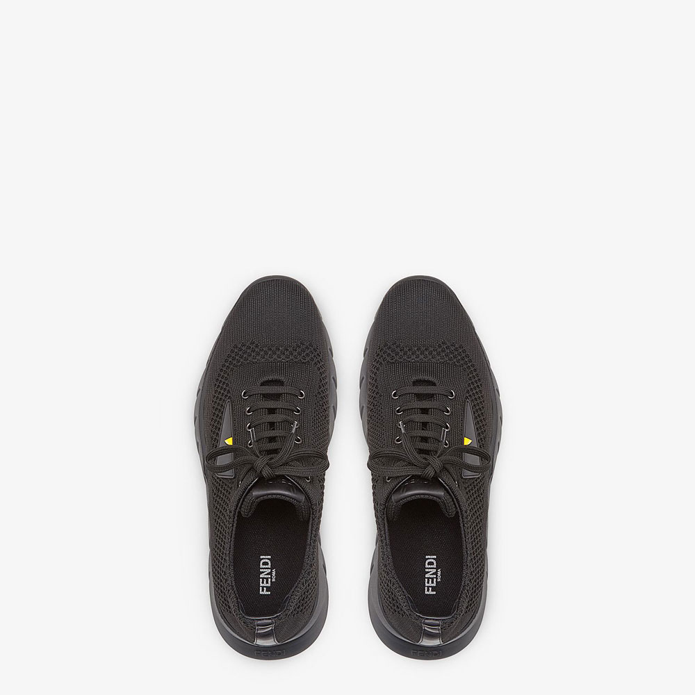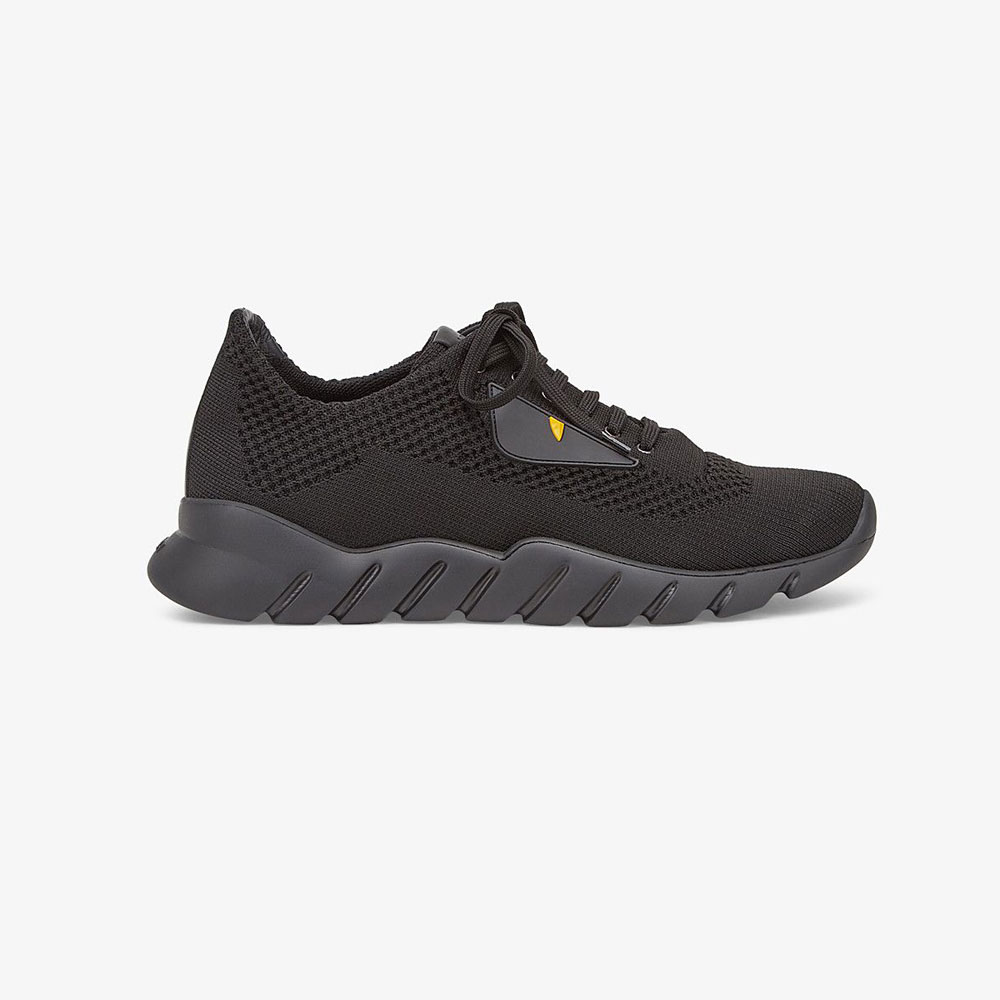 Lace-up sneakers in textured black tech knit, decorated with a yellow stud and black leather applique in the shape of the Bag Bugs eyes on the outer side. The finishing touch is the tone-on-tone running-style high sole with flexible and anti-slip tread. Laces and eyelets in black-finish metal.