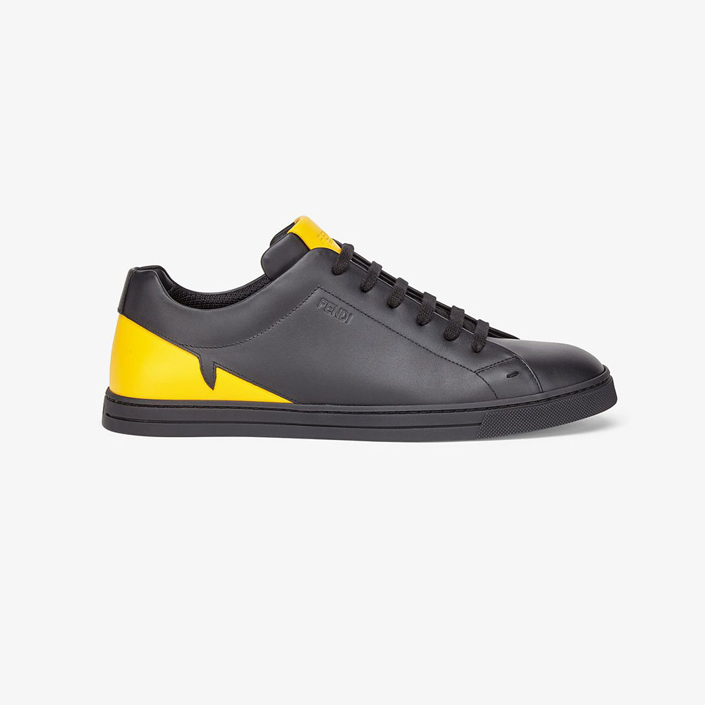 Lace-up sneakers with rubber cupsole. Made of black leather. Corner Bugs-shaped inserts in yellow leather on the tongue and on the outside of the heel.