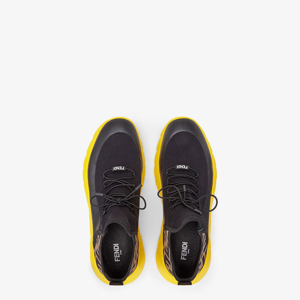 Running sneakers with thin elastic laces. Undulated rubber soles. Made of black tech mesh. The details in black rubberised film accentuate the shape of the shoe. Embellished with a FF mesh insert on the back and yellow sole.