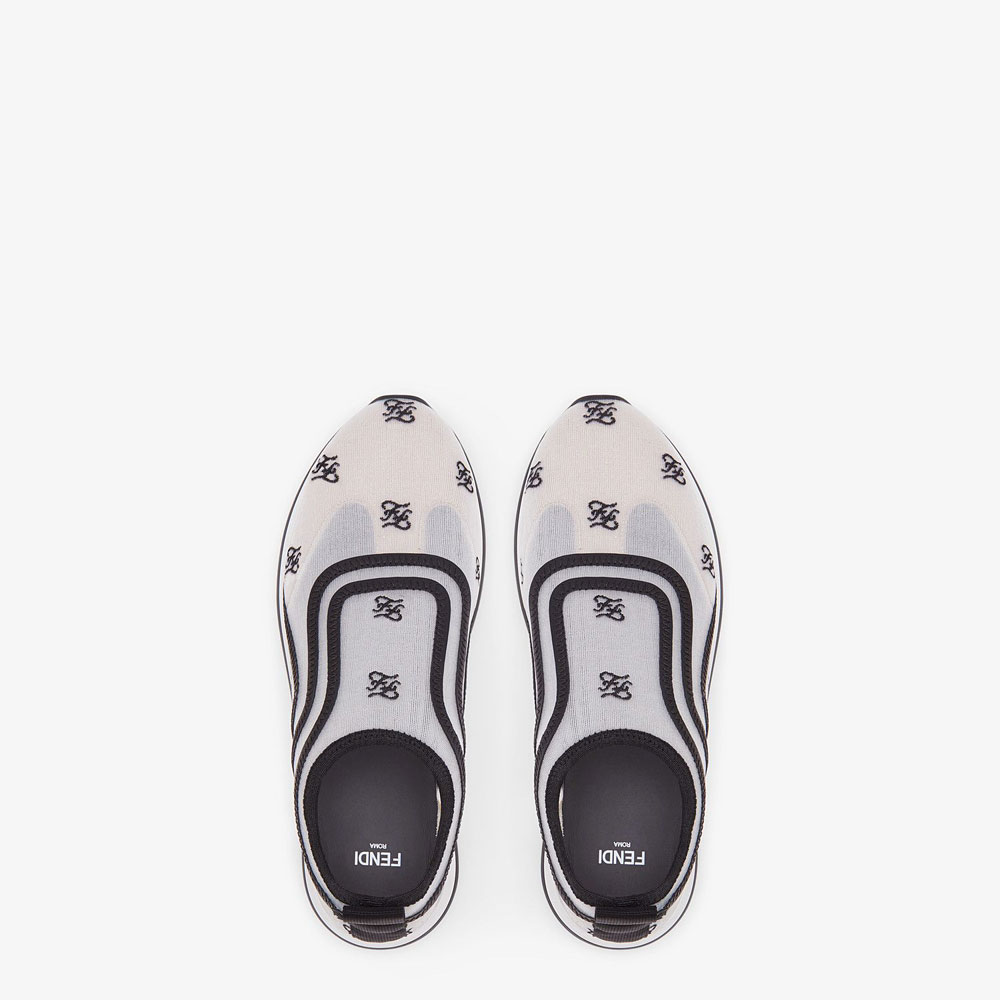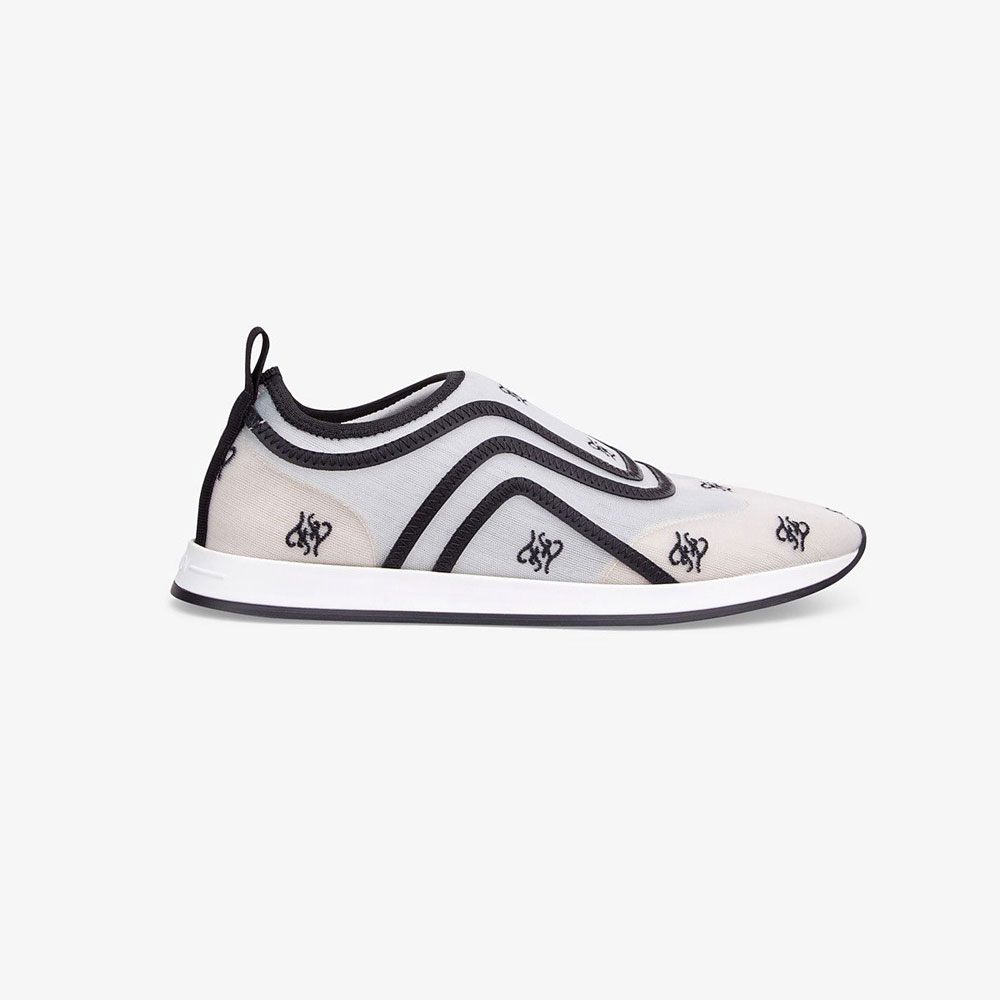 Slip-on sneakers with rubber sole. Made of white mesh. All-over FF Karligraphy motif embroidered all over in black. Finished with contrast stitching and profiles.