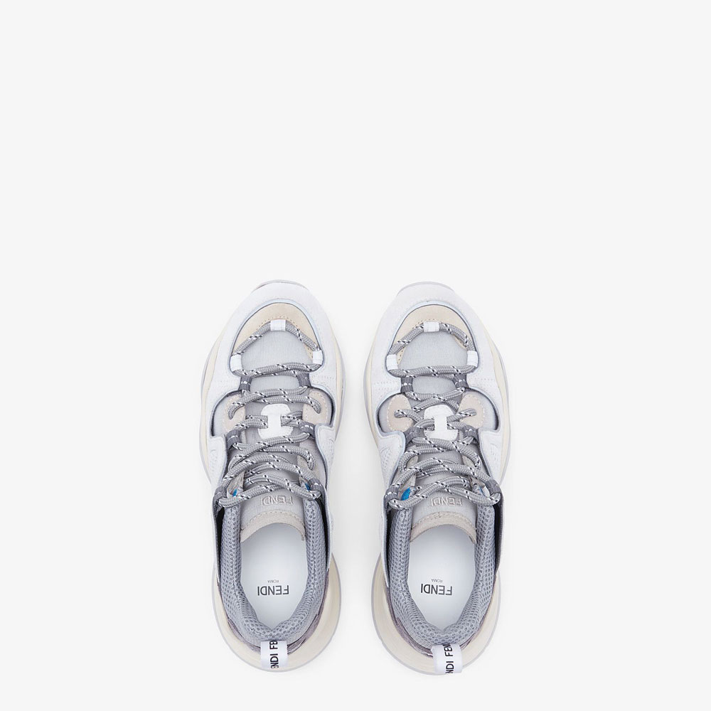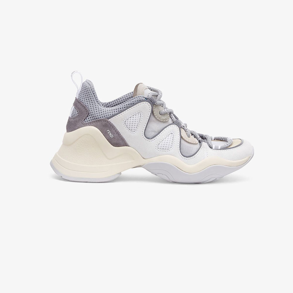 Lace-up running sneakers with multilayer, corrugated soles. Made of white and grey suede. Finished with details in tech stretch jersey. Personalised with Fendi lettering and the Rome Palazzo della Civilta coordinates. Trekking laces.