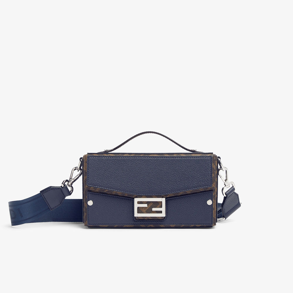 Soft Trunk Baguette Bag with dark blue full-grain leather panels superimposed on brown FF canvas. Flap with magnetic FF clasp