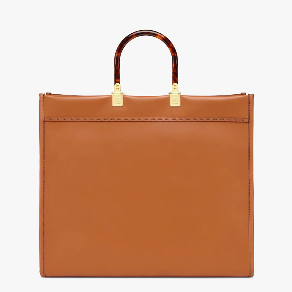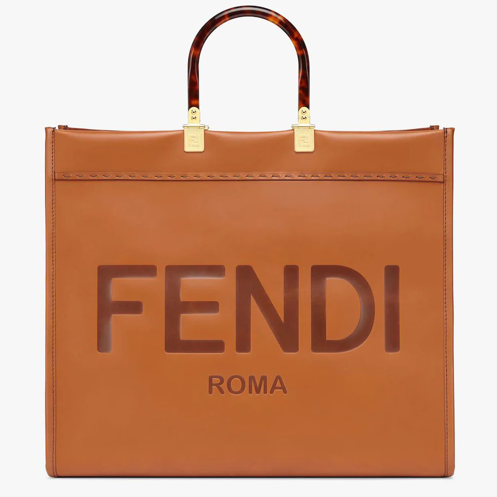Sunshine Shopper made of brown leather with hot-stamped �FENDI ROMA� motif. Featuring a spacious internal compartment lined in Alcantara and gold-finish metalware. Can be carried by hand with the two tortoiseshell plexiglass handles while the two inner hooks allow you to attach a shoulder strap. Size:W40.5 x H35 x D21.5cm