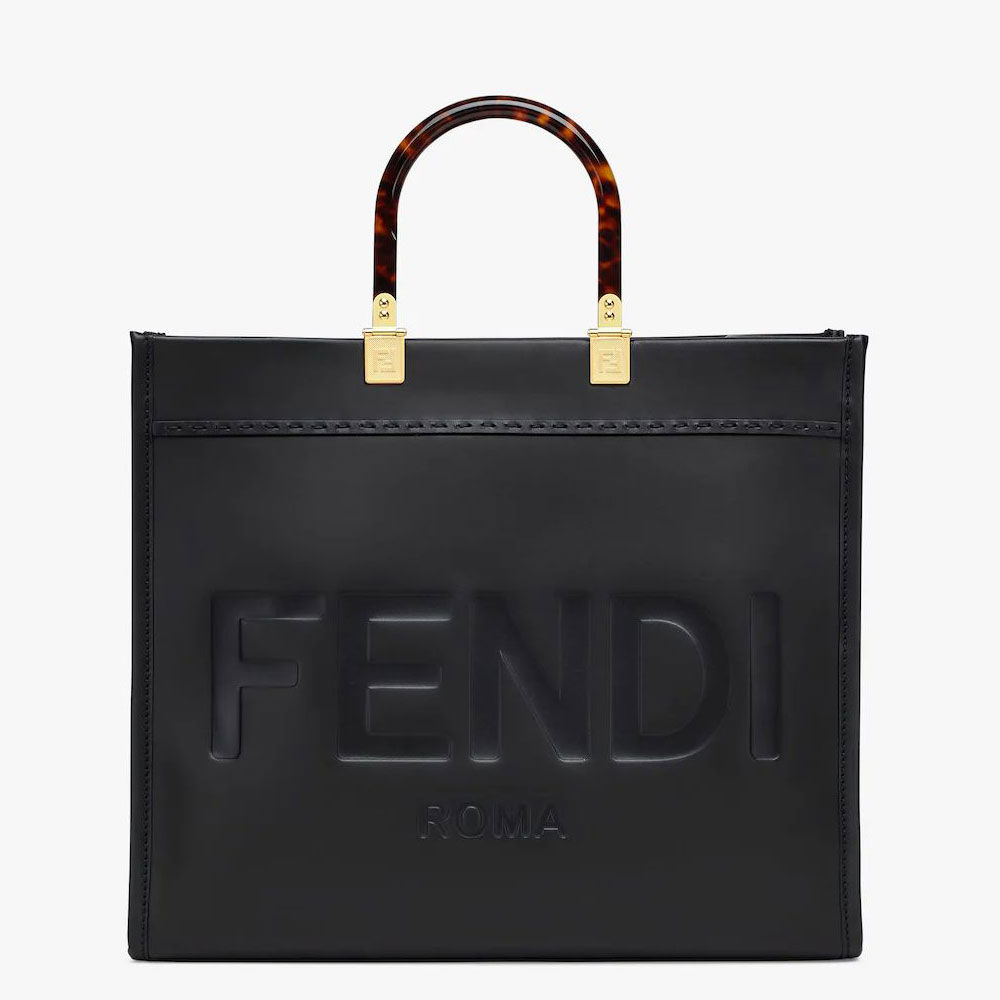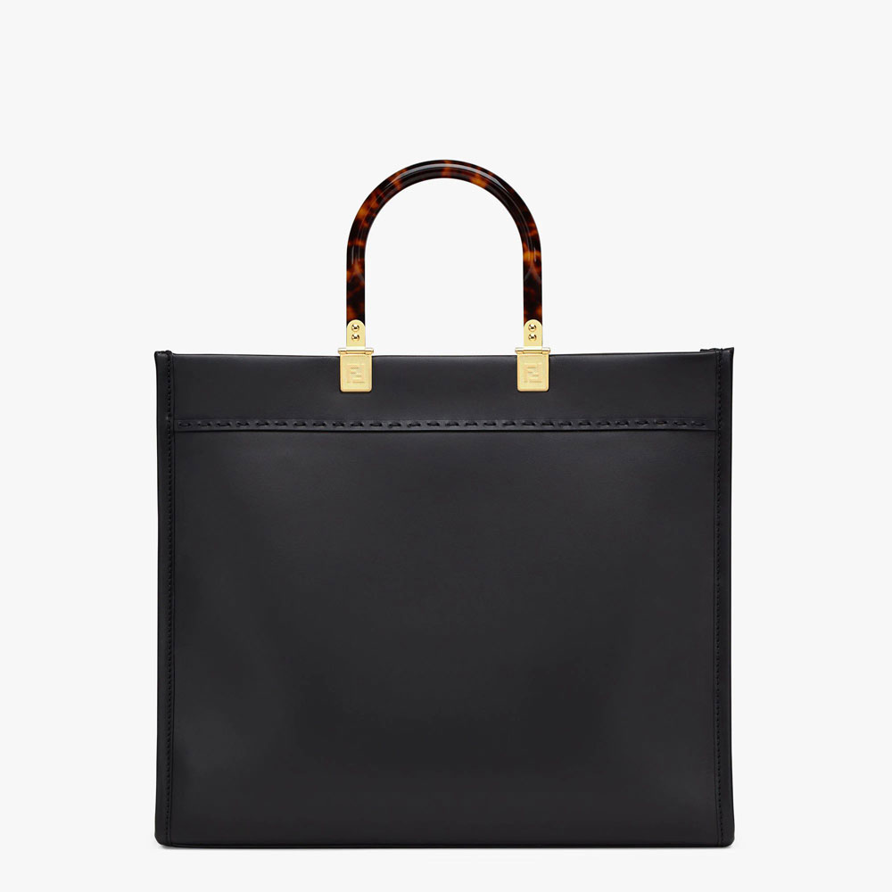 Medium Sunshine Shopper bag made from black leather with hot-stamped �FENDI ROMA� and stiff tortoiseshell plexiglass handles.