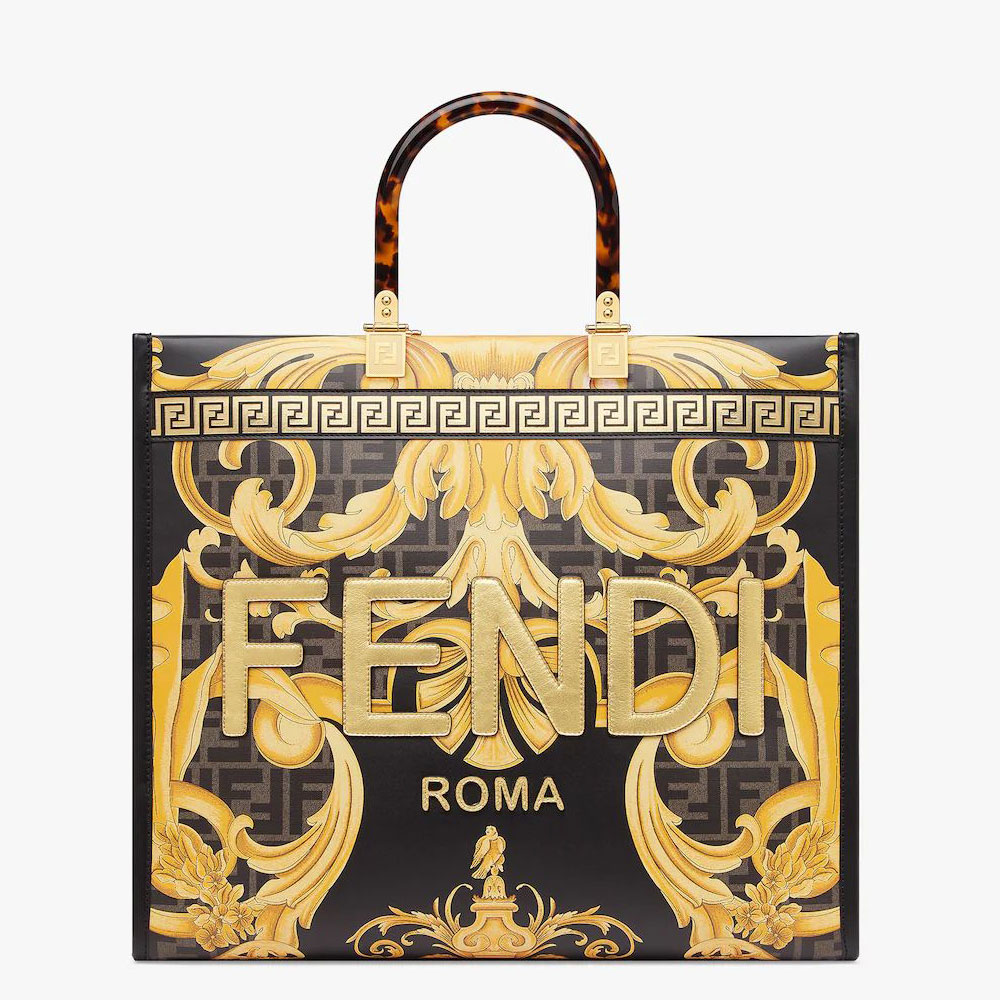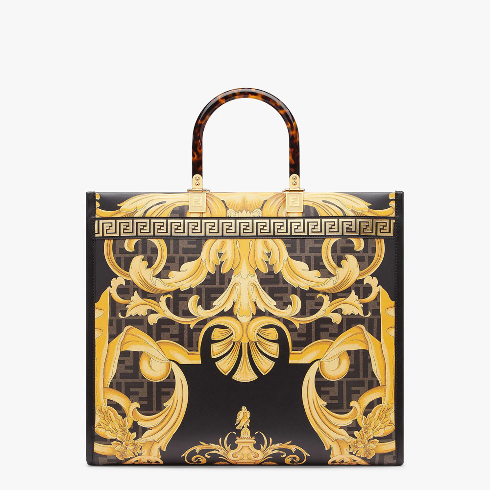 Medium Sunshine shopper made of leather with a Versace by Fendi print. Born of the creative collaboration between the two fashion houses. the graphics combine the iconic Fendi FF logo with the Versace Baroque print in black and gold. Gold laminated leather "FENDI ROMA" lettering and stiff tortoiseshell-effect plexiglass handles.