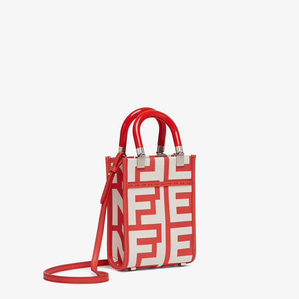 Sunshine Shopper mini bag made of leather printed with the Fendi Roma logo in white and red. Reinterpreted by Marc Jacobs in an all-over.