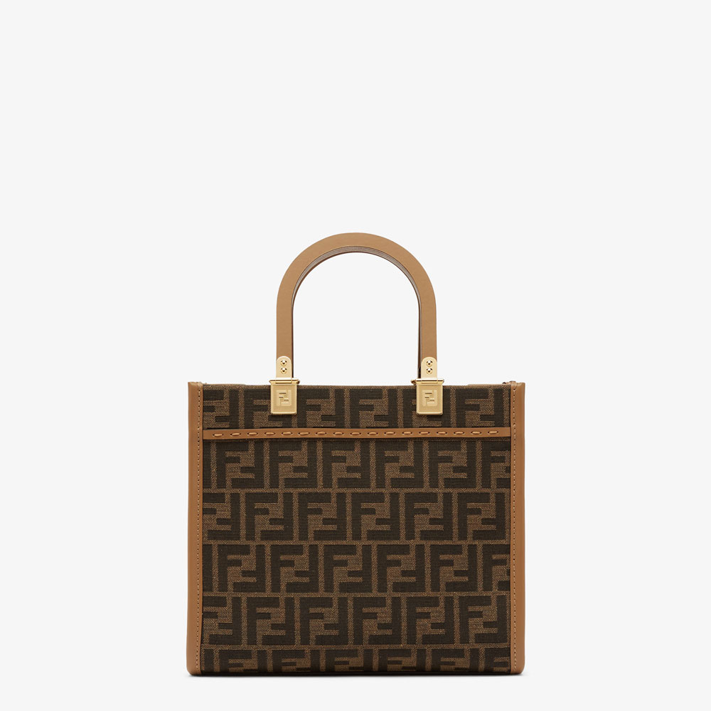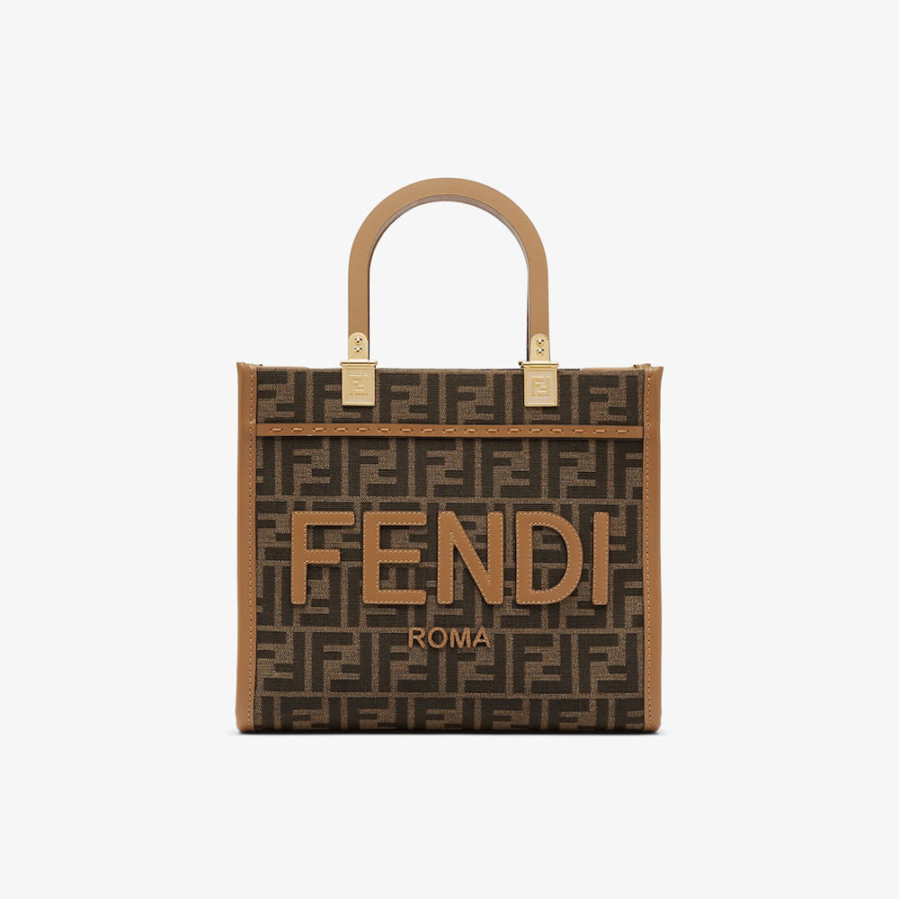 Small Sunshine shopper bag made of fabric with jacquard FF motif and sand-coloured leather FENDI ROMA lettering. Sand-coloured plexiglass stiff handles.