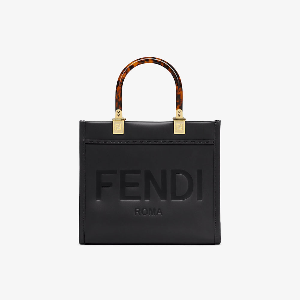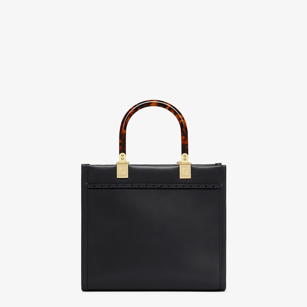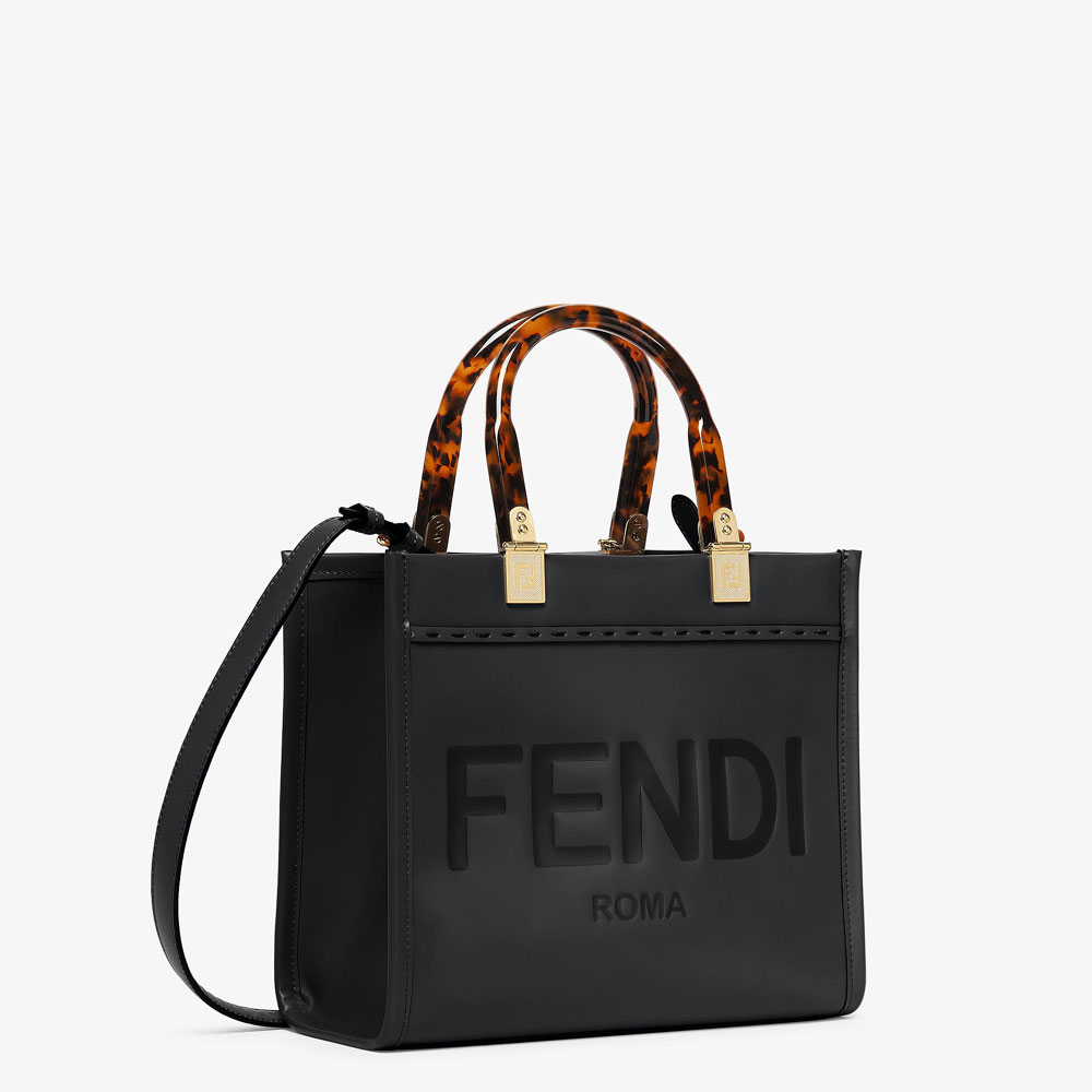 Small Sunshine Shopper bag made of black leather with hot-stamped FENDI ROMA lettering and stiff tortoiseshell plexiglass handles.