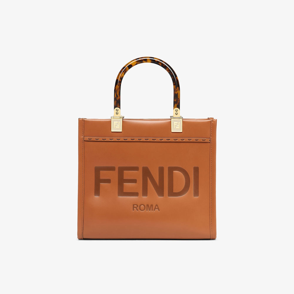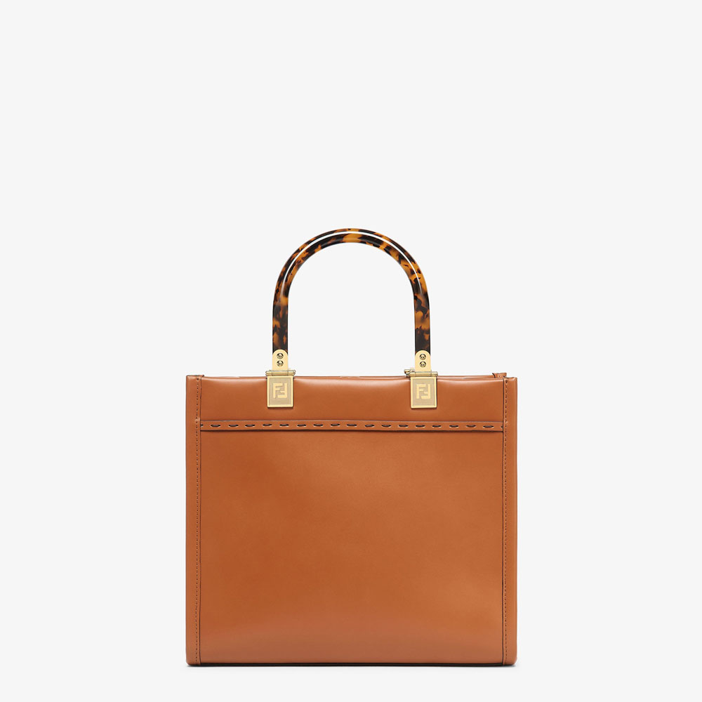 Small Sunshine Shopper bag made of brown leather with hot-stamped FENDI ROMA and stiff tortoiseshell plexiglass handles.