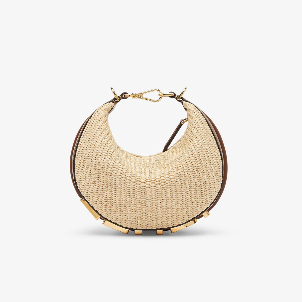 This Fendigraphy Mini Natural raffia mini bag is a must-have accessory for any fashion-forward woman. The attention to detail in the design, from the natural-colored woven raffia to the brown leather trim and vintage gold metal FENDI lettering, is truly impeccable. The zipper closure and fabric-lined internal compartment add functionality to this stylish piece.