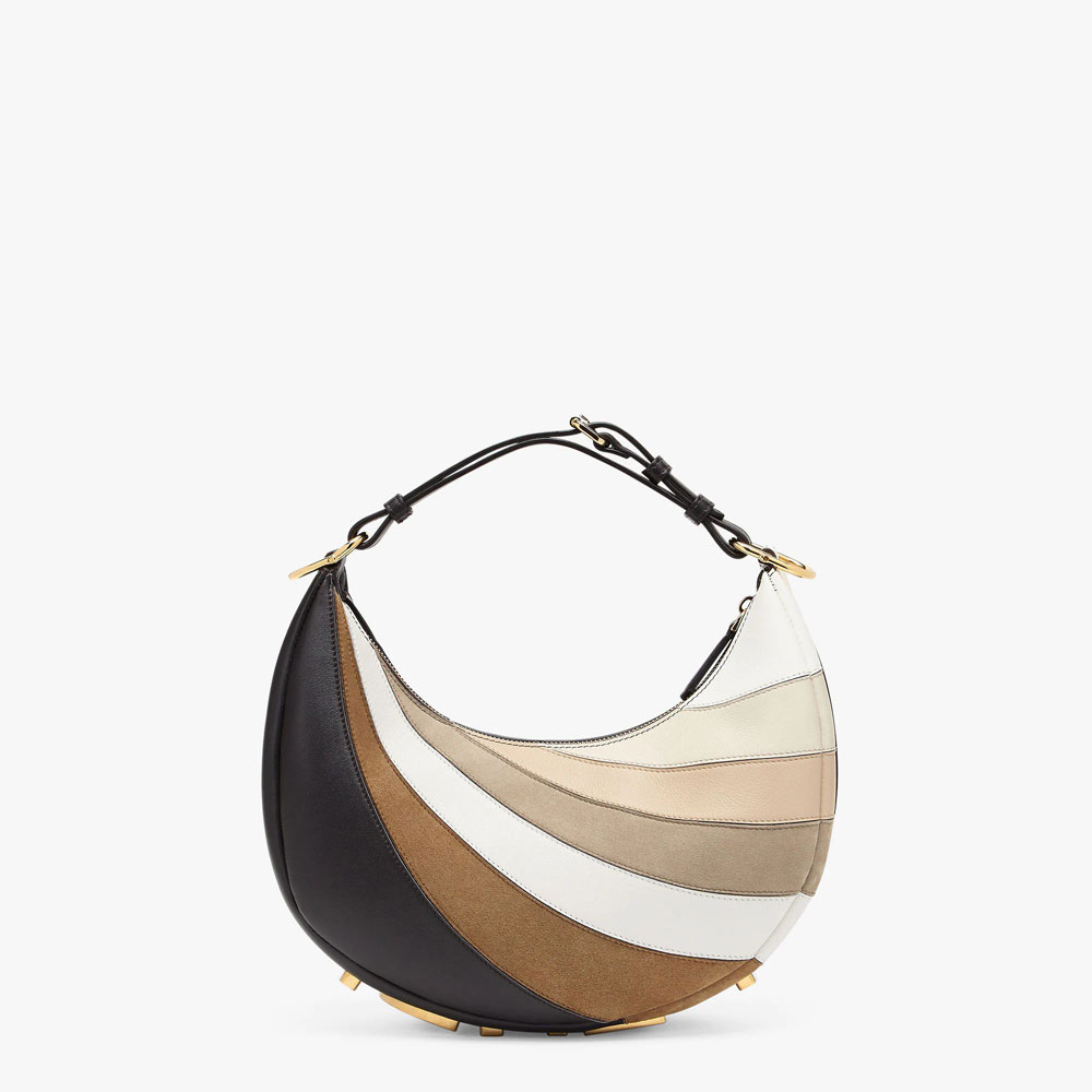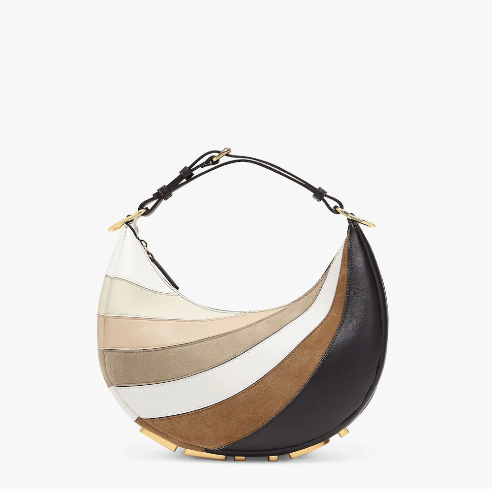 Small Hobo bag produced by inlaying leather. laminated leather and suede by hand to a rainbow diagonal striped motif in shades of beige and brown. With vintage gold metal FENDI lettering visible when the bag is worn under the arm.