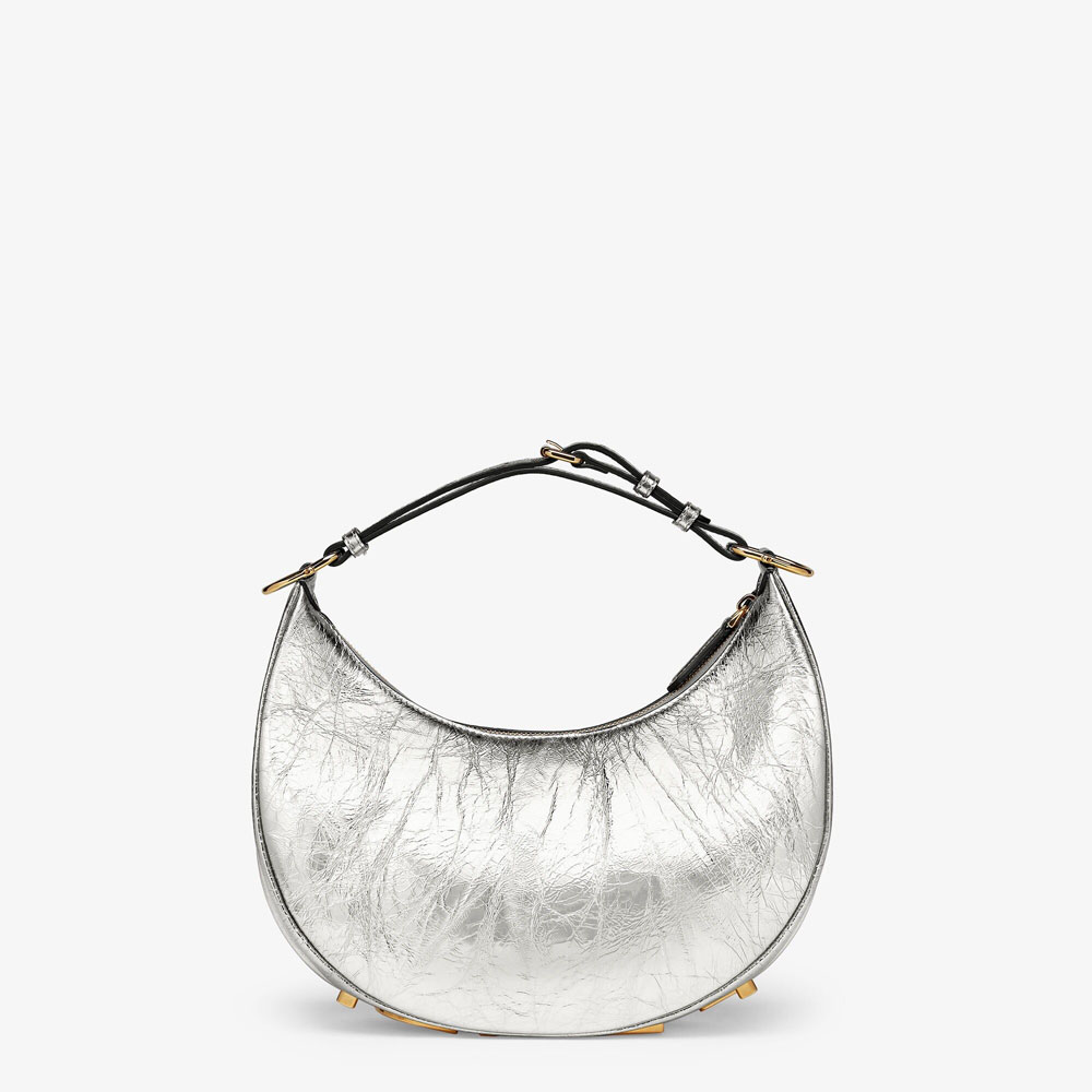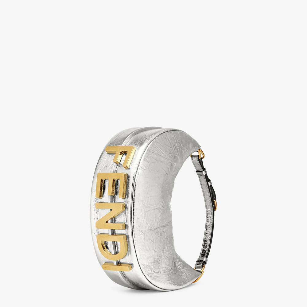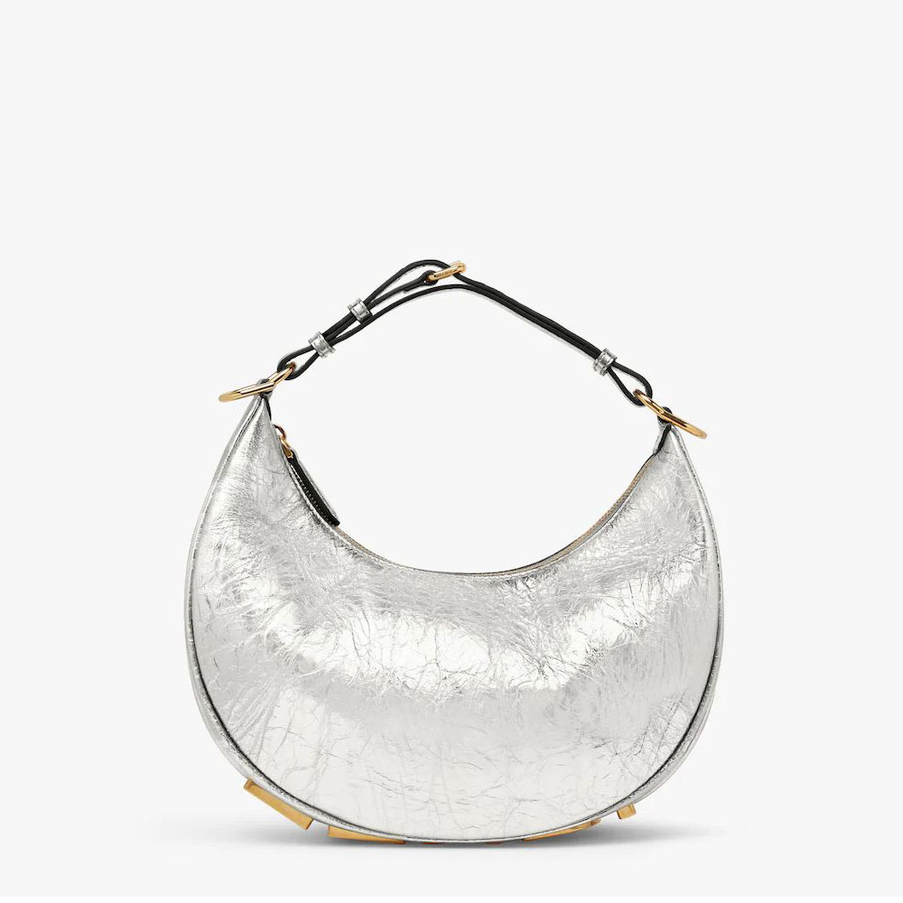 Small Hobo bag made of silver soft laminated leather with a craquel� effect. With vintage gold metal FENDI lettering visible when the bag is worn under the arm.