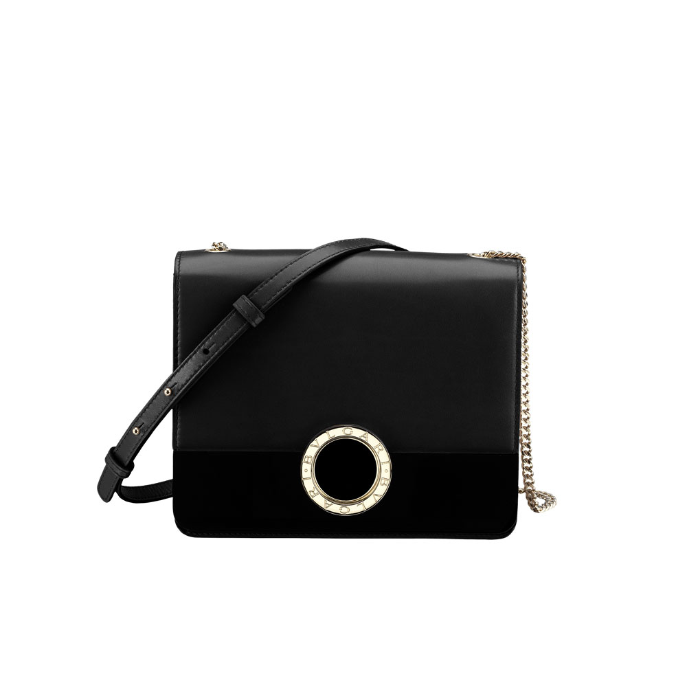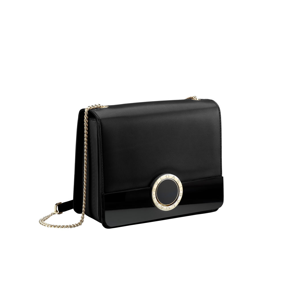 Flap cover "BVLGARI-BVLGARI" Signature Bag in black calf leather with light gold-plated brass parts. Black perspicio bar, iconic double logo motif and magnetic closure finished in black enamel. Three gussets and one open pocket. Adjustable leather and chain strap. 19 x 15.5 x 9 cm - 7.5 x 6.1 x 3.5"