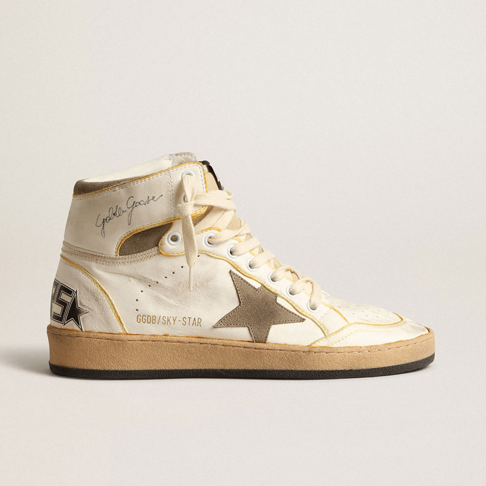 A reinterpretation of high-top sneakers with an authentic soul: inspired by our Ball Star model. Our Sky-Star sneakers have an American college vibe and a feel of the basketball scene of the Eighties. This mens model. With a yellowed-effect white nappa leather upper.