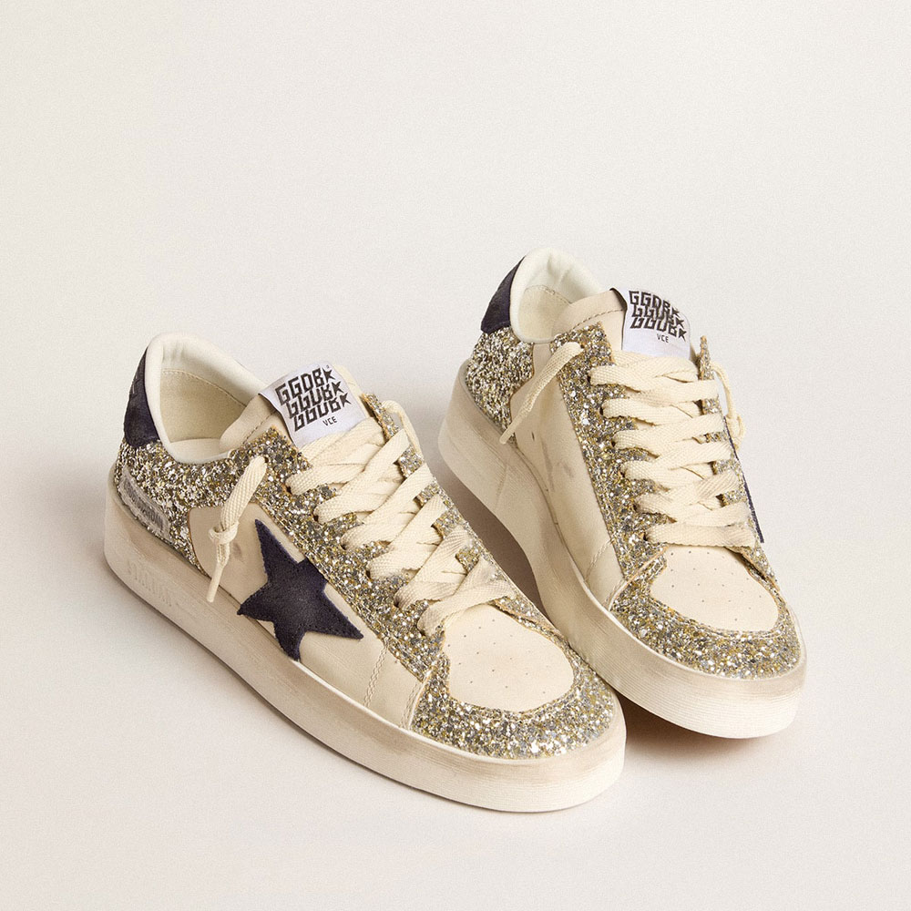 Golden Goose Stardan in platinum glitter with dark blue suede star and heel tab