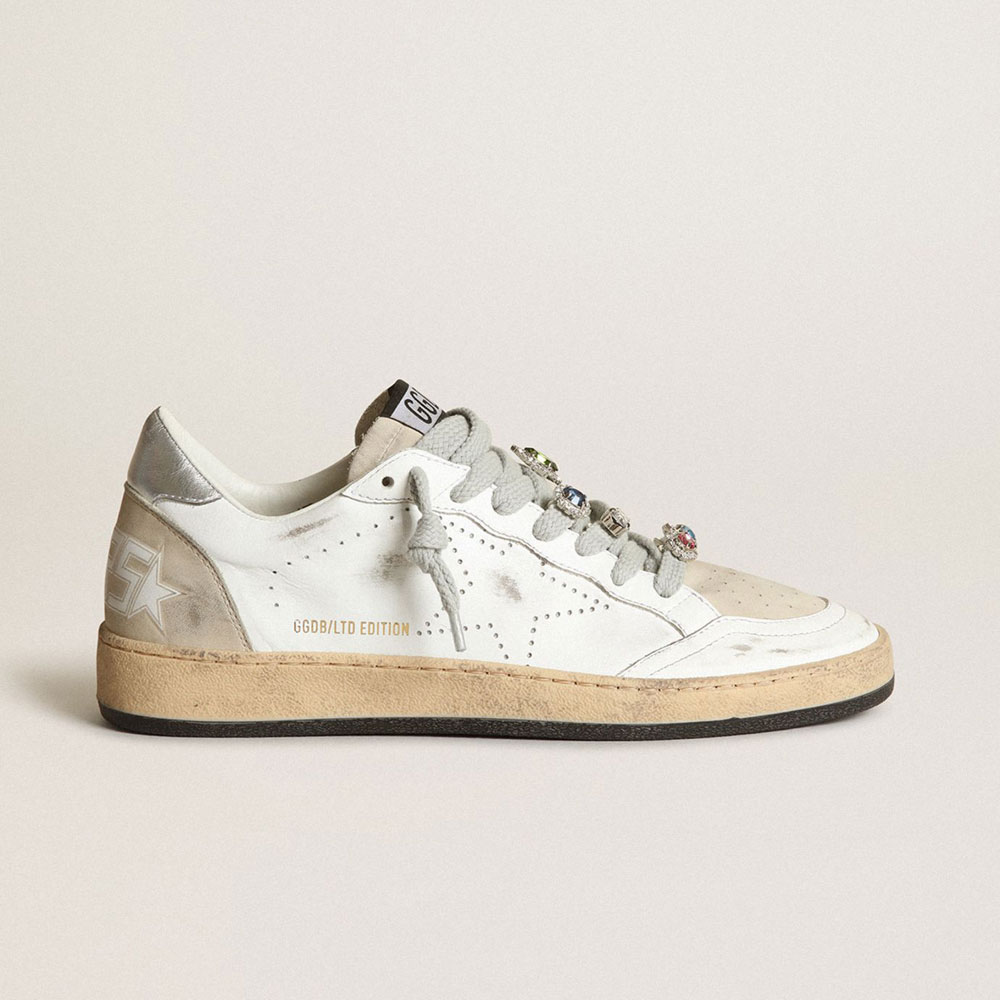 Dreaming of the Eighties. Our Ball Star sneakers have an American college vibe and a feeling of the basketball scene around at the time. These limited edition. numbered LAB sneakers feature a white leather upper and tone-on-tone perforated star. Lace accessories with multicolored crystals add a unique touch of sparkle to the ice-gray colored laces. The tongue in ice-gray nubuck with perforations on the toe. the silver metallic leather heel tab and the ice-gray nubuck insert on the back complete the look.