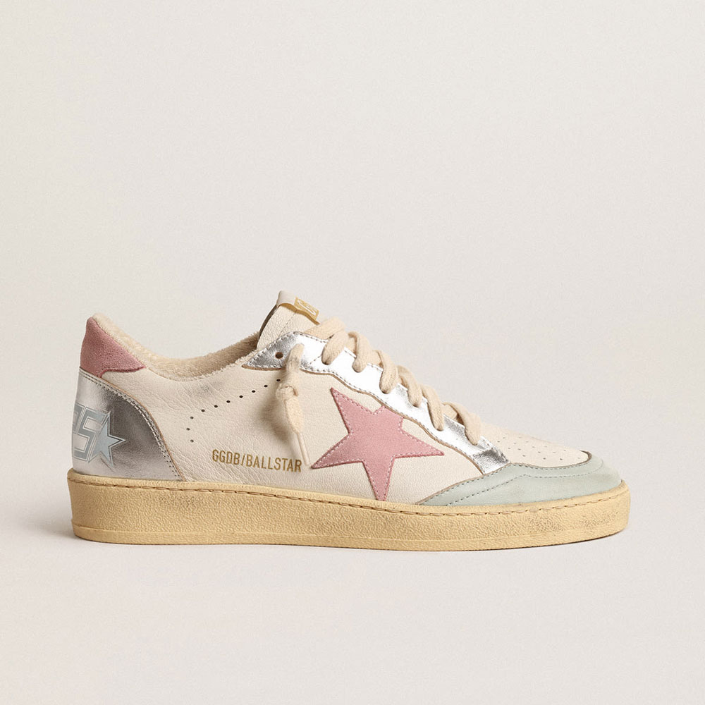 Dreaming of the Eighties. Our Ball Star sneakers have an American college vibe caught between a hoop shot and a skateboard ride. This model. with a cream-colored nappa leather upper and gray leather toe cap. features details in old-rose suede. such as the star and heel tab. and metallic leather inserts. in silver on the right sneaker and platinum on the left. The cream laces complete the style: beautiful things that never go out of fashion.