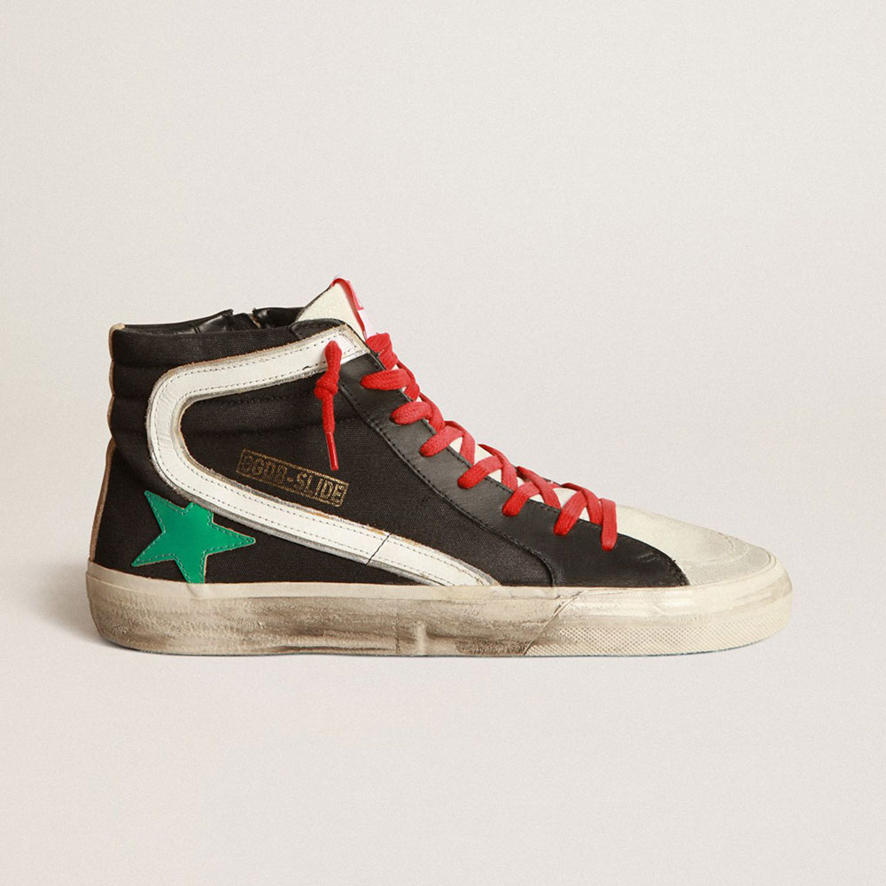 Slide sneakers are our purest expression of the skateboarding world. An American vibe with a glamorous touch that translates into streetwear style. ideal for metropolitan looks. This model toys with combinations of various textures and fabrics for the upper: canvas for the upper. leather for the star and flash.
