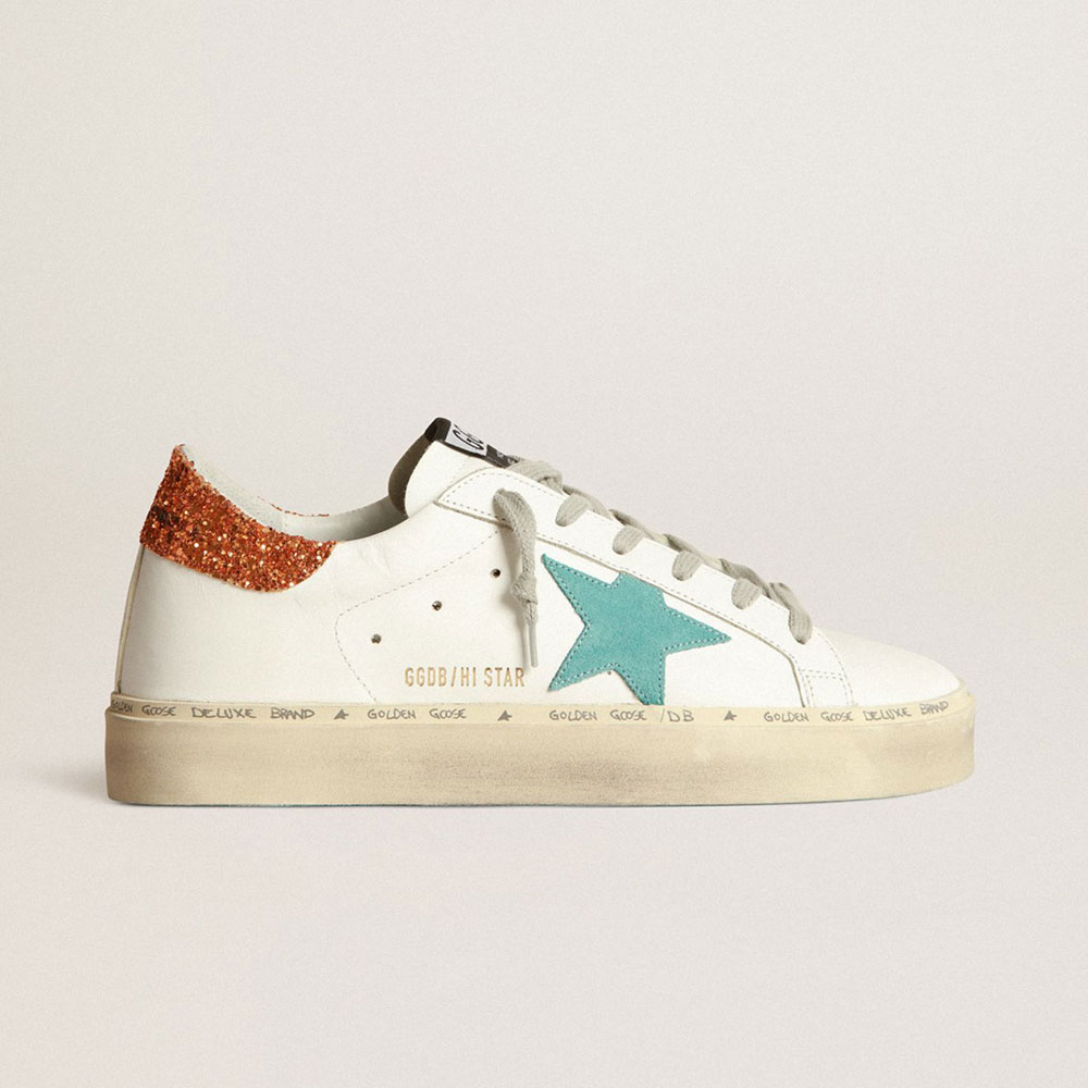 Double height and iconic design: inspired by our Super-Star sneakers. the Hi Star sneakers feature double foxing. embellished with hand lettering. This white leather model features a sky-blue suede star and a peach-pink glitter heel tab. And ice-gray laces add the finishing touch.