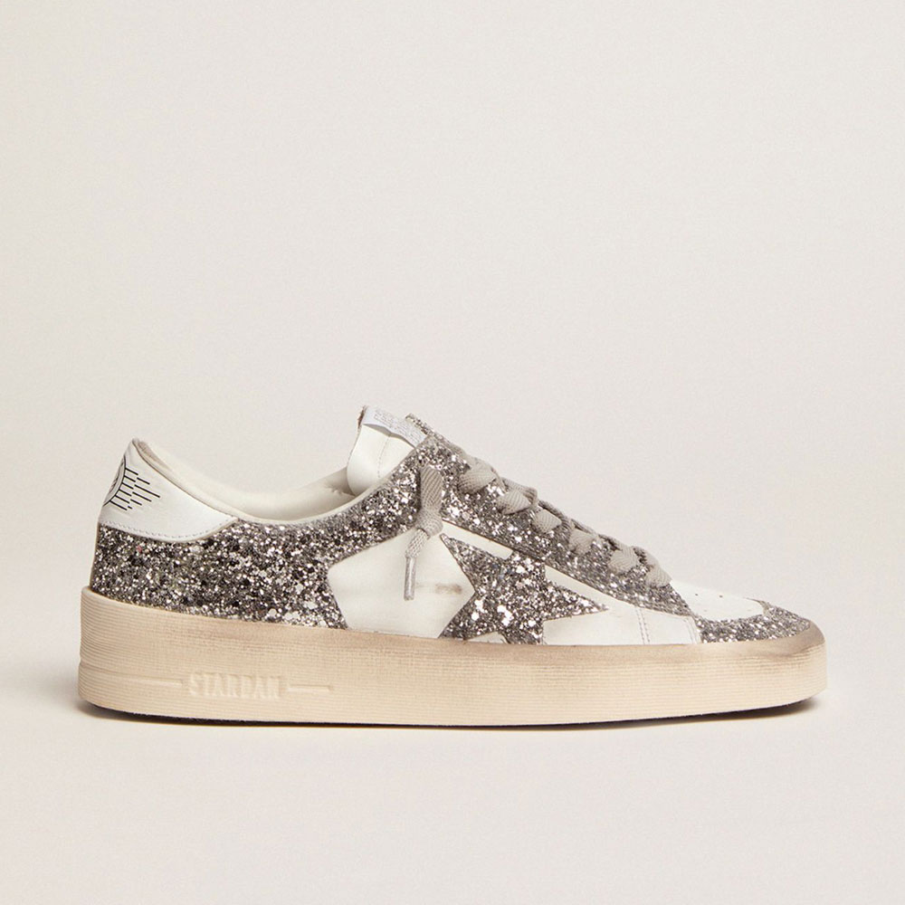 The glorious Nineties wrapped up in a sneaker. The Stardan sneakers pay homage to the basketball icons of that decade. while keeping an eye on the present. This version features a white leather and silver glitter upper. The silver glitter star and white leather heel tab add the finishing touches.