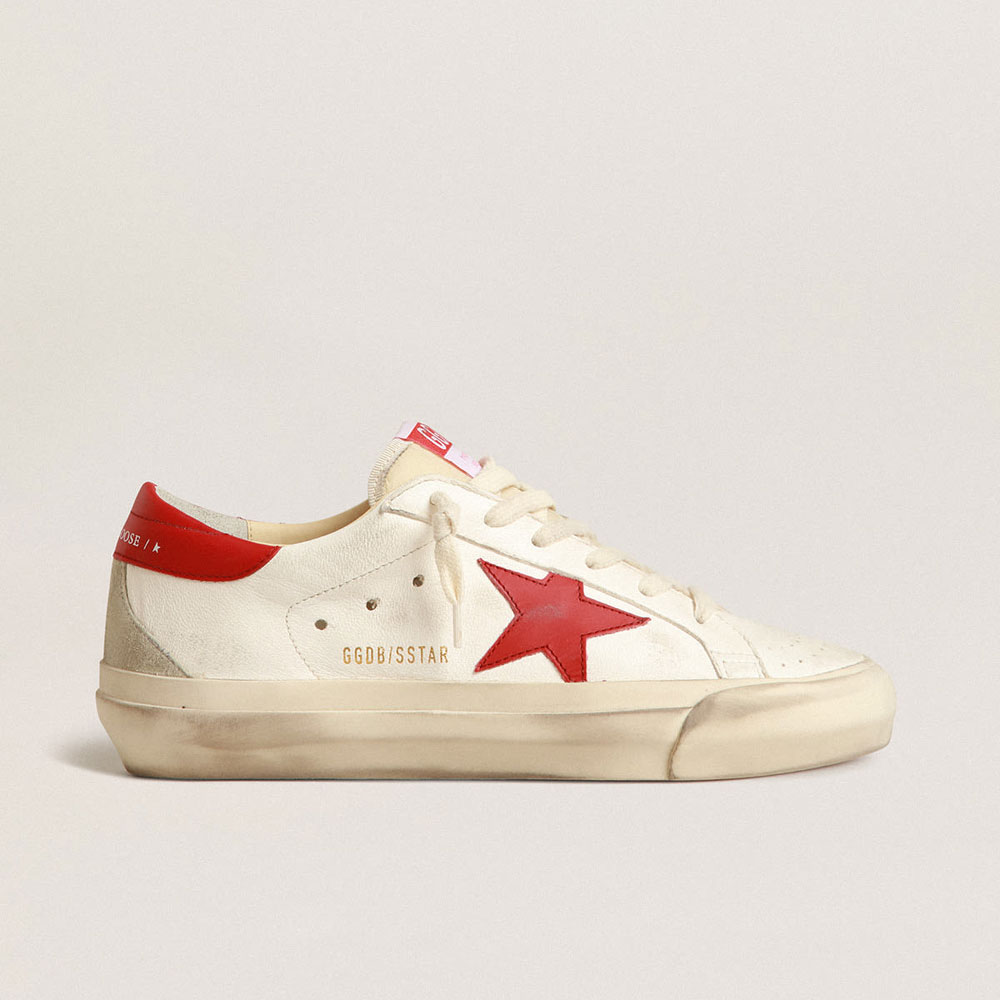 A timeless icon yet one thats constantly evolving. At Golden. we love taking our classics and reworking them all the time. always from a new angle. These men's Super-Star with a white nappa leather upper feature a red leather star and heel tab. The ice-gray suede insert on the back. beige nylon tongue and cream-colored laces add the finishing touch.