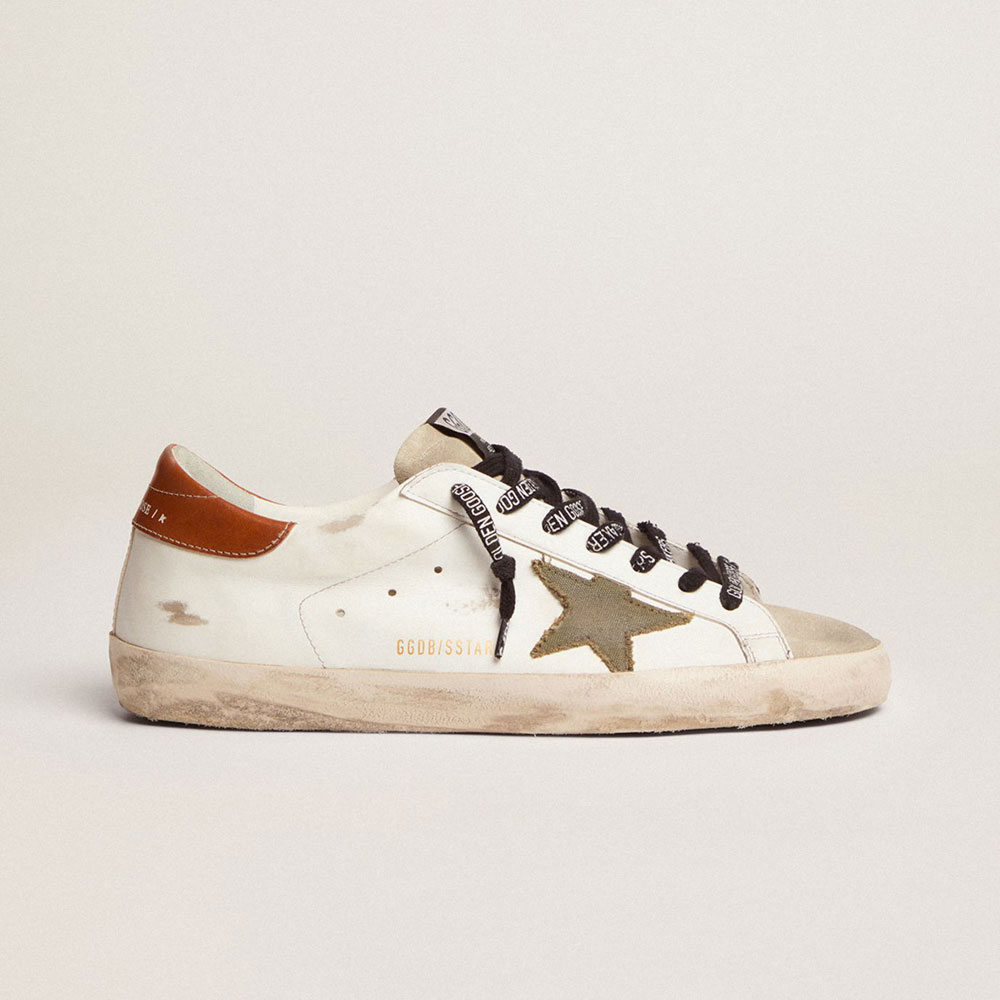 A timeless icon yet one thats constantly evolving. At Golden. we love taking our classics and reworking them all the time. always from a new angle. This white leather model features an olive-green canvas star. tan leather heel tab and ice-gray suede tongue. And the black laces with contrasting logo add a stylish finishing touch.