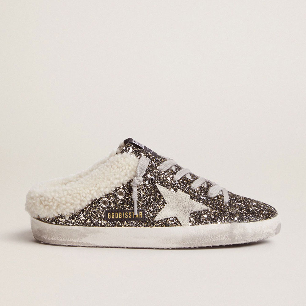 We love to take our most iconic styles and update them with refined details. giving them a new identity. The design of these Super-Star sneakers has been changed. removing the back section to become a comfortable sabot style. made even more special by the shearling lining and upper covered with glitter.